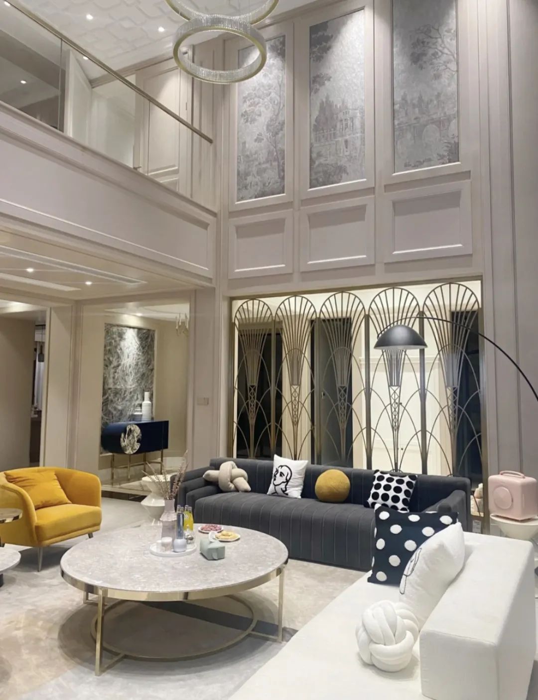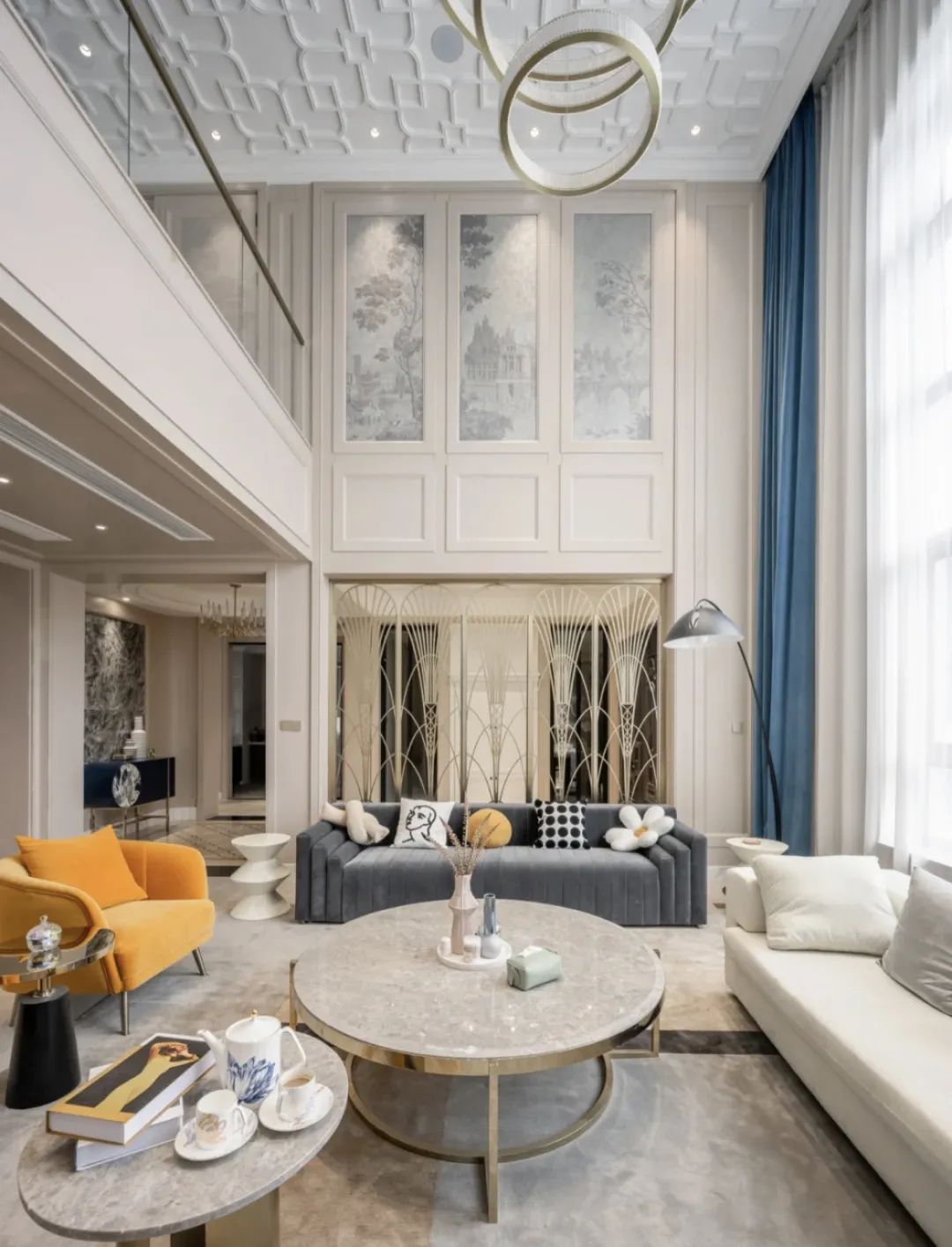 客厅的挑空设计让整体更加大气通透。多个沙发的组合,可以容纳更多的亲朋好友,鲜明的颜色更具热情和温馨。