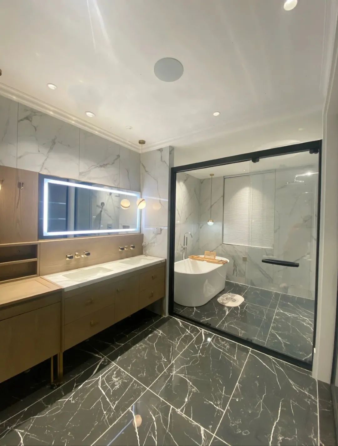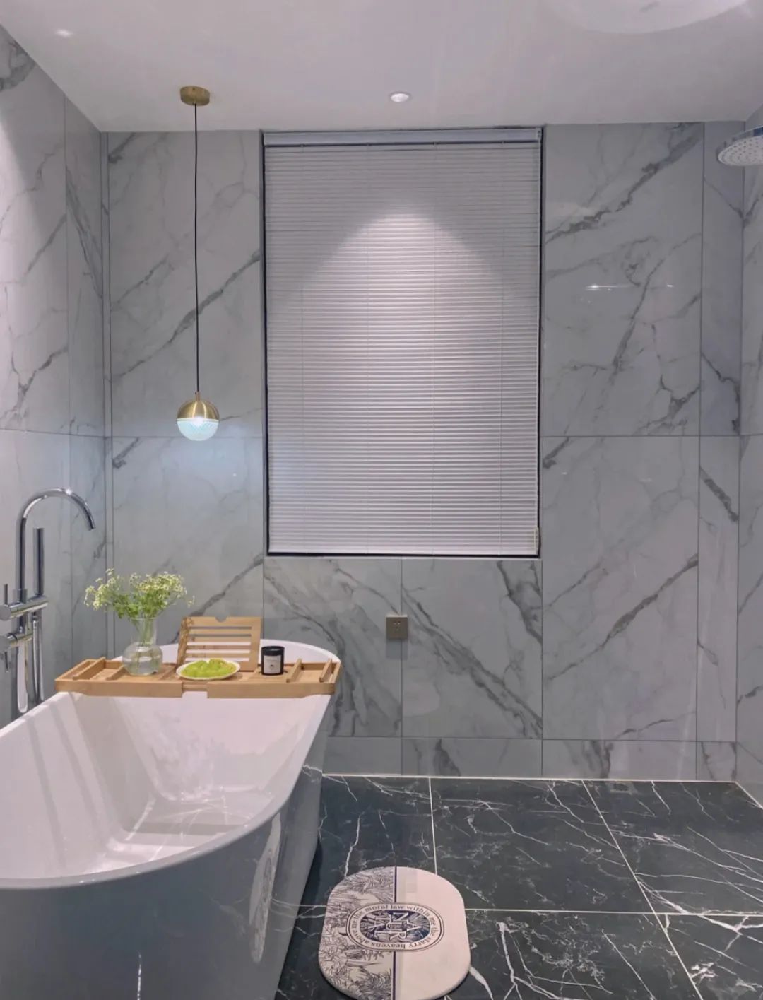 卫生间采用了干湿分离的设计,透明的玻璃门丝毫不会影响整体的空间感。浴缸处的百叶窗设计还可以做投影。晚上回到家,卸下一身疲惫,在浴缸里泡个澡,看着最近最爱的电影,简直不要太舒服。