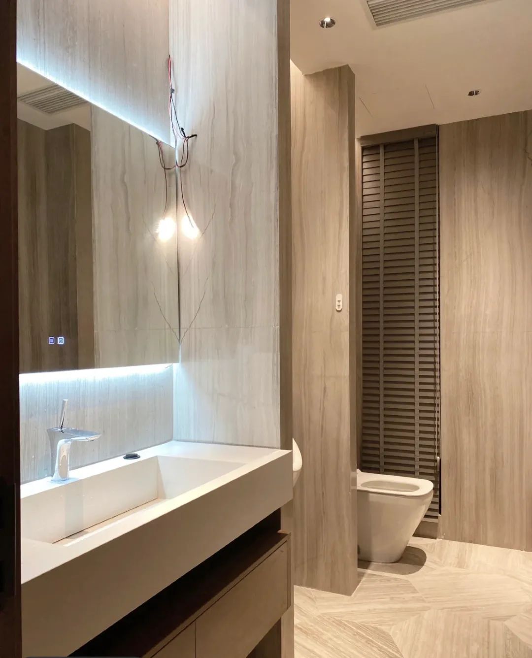 卫生间分为主卫生间和公共卫生间。会发现都进行了便池和马桶的分开式设计,更加干净卫生,而且隔断式设计也具有更好的隐私性。