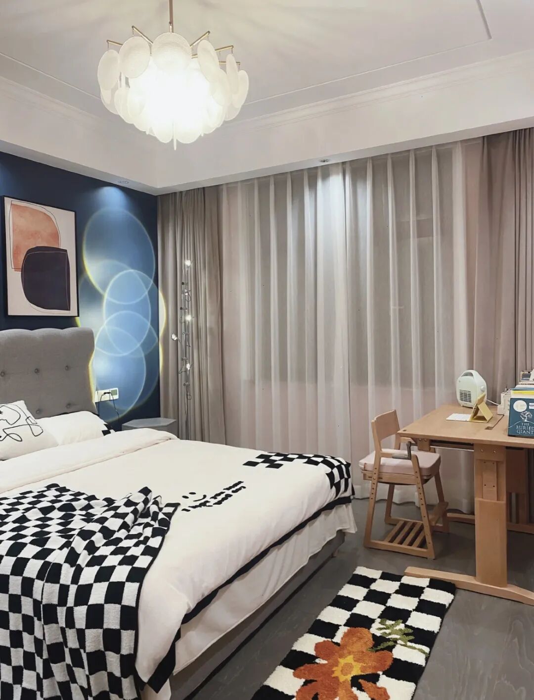 卧室的设计很少女。淡粉色的窗帘从上面垂下,搭配上艺术感十足的球形吊灯与墙面的光圈相呼应,赋予空间简约灵动的美感。