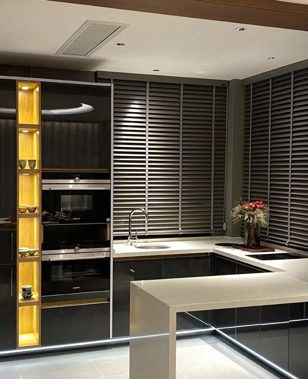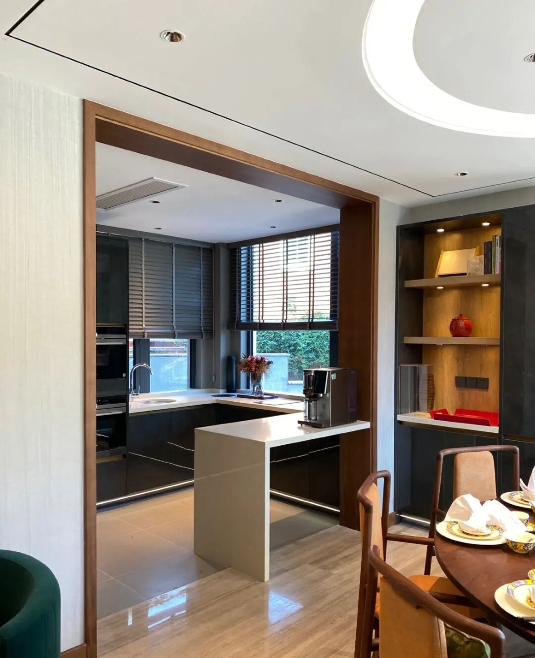 开放式的厨房设计了一个小岛台,早上起来喝杯咖啡做个早餐很是方便。嵌入式的家电让整个空间看上去更加整洁开阔,没有多余的清洁死角。