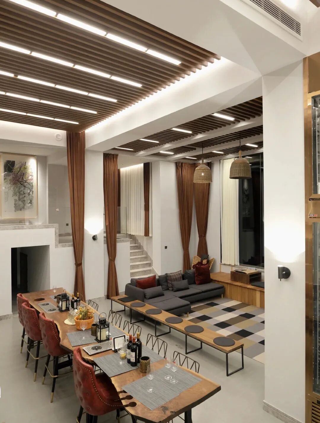 新中式的装修风格,大气复古!地下室是一个多功能区域,可以是客厅也可以是餐厅。垂下的棕色窗帘与整体的实木色形成完美的呼应,更具整体感。复古的吊灯也是点睛之笔。