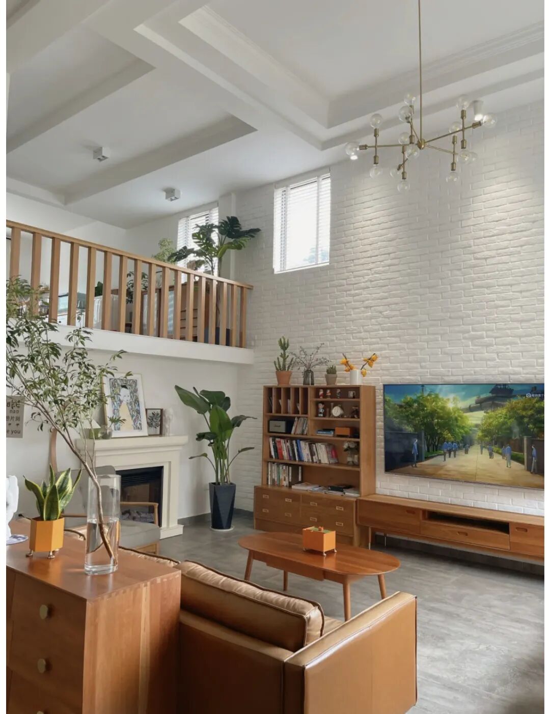 整体墙面采用了白色文化砖,清晰裸露的纹理,不仅没有粗糙感,反而让整个空间更具艺术气息。棕色皮质沙发,与电视柜、茶几、书架呼应,不会十分跳脱,又让客厅更加温馨舒适。