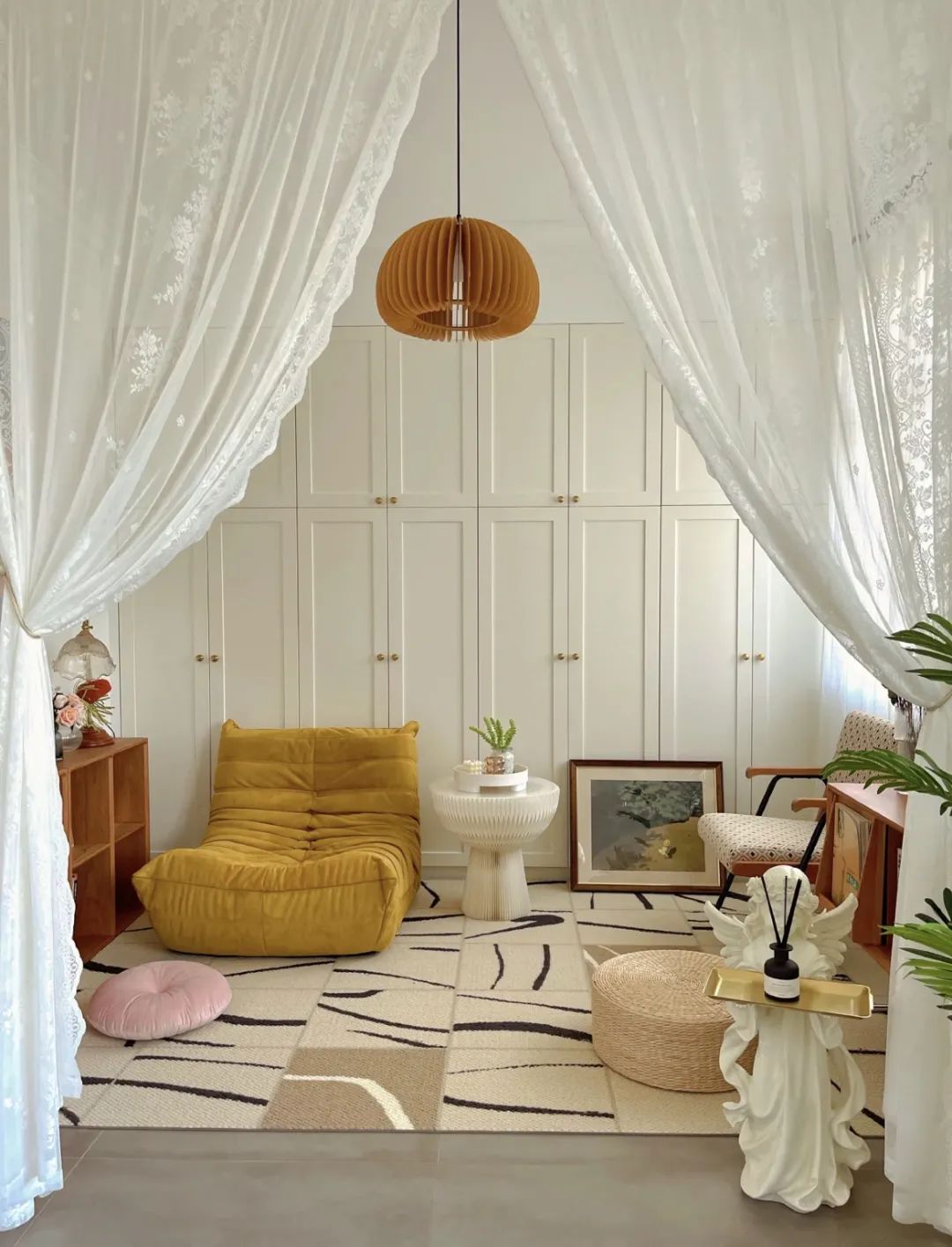 主卧里面更是内有玄机,是一个40㎡套间的形式,共分成3个区域。主卧卧室面积大概15㎡,黄色和白色的搭配暖意十足,毛毛虫的懒人沙发俏皮又活泼。