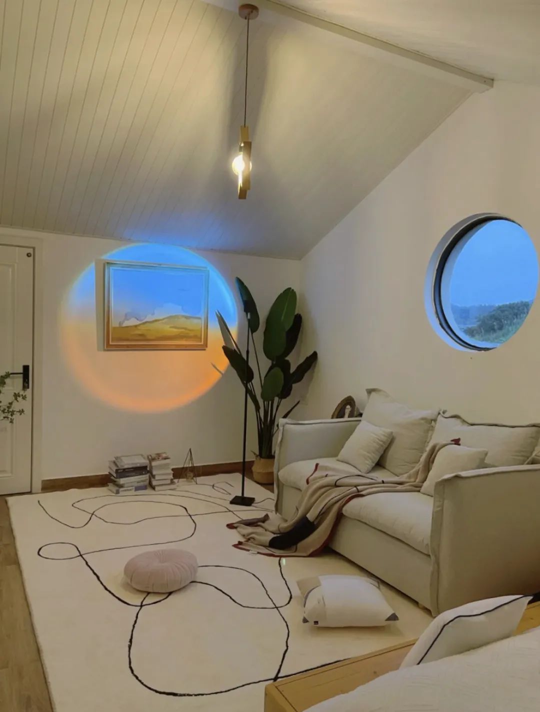 阁楼的影音室设计真的是一绝!空间虽然不大,但是作为一个休闲娱乐的地方也绰绰有余,在上面看看电影、玩玩游戏画面感十足!一扇圆窗、一个沙发、一盏吊灯、一盆绿植简单却不减幸福感。