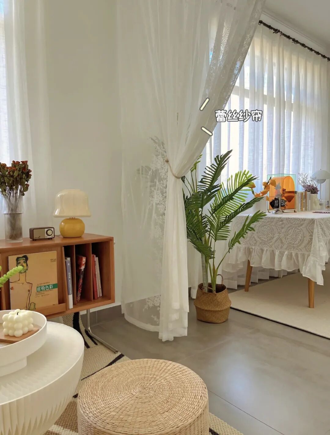 温馨浪漫的法式小书房,布艺的地毯配上矮墩,看上去暖意十足。在这里可以陪着孩子一起看看书,有一个惬意的亲子时光。蕾丝纱帘旁边还有书桌,书桌窗外就是蓝天白云,也可以有属于自己的办公时间。