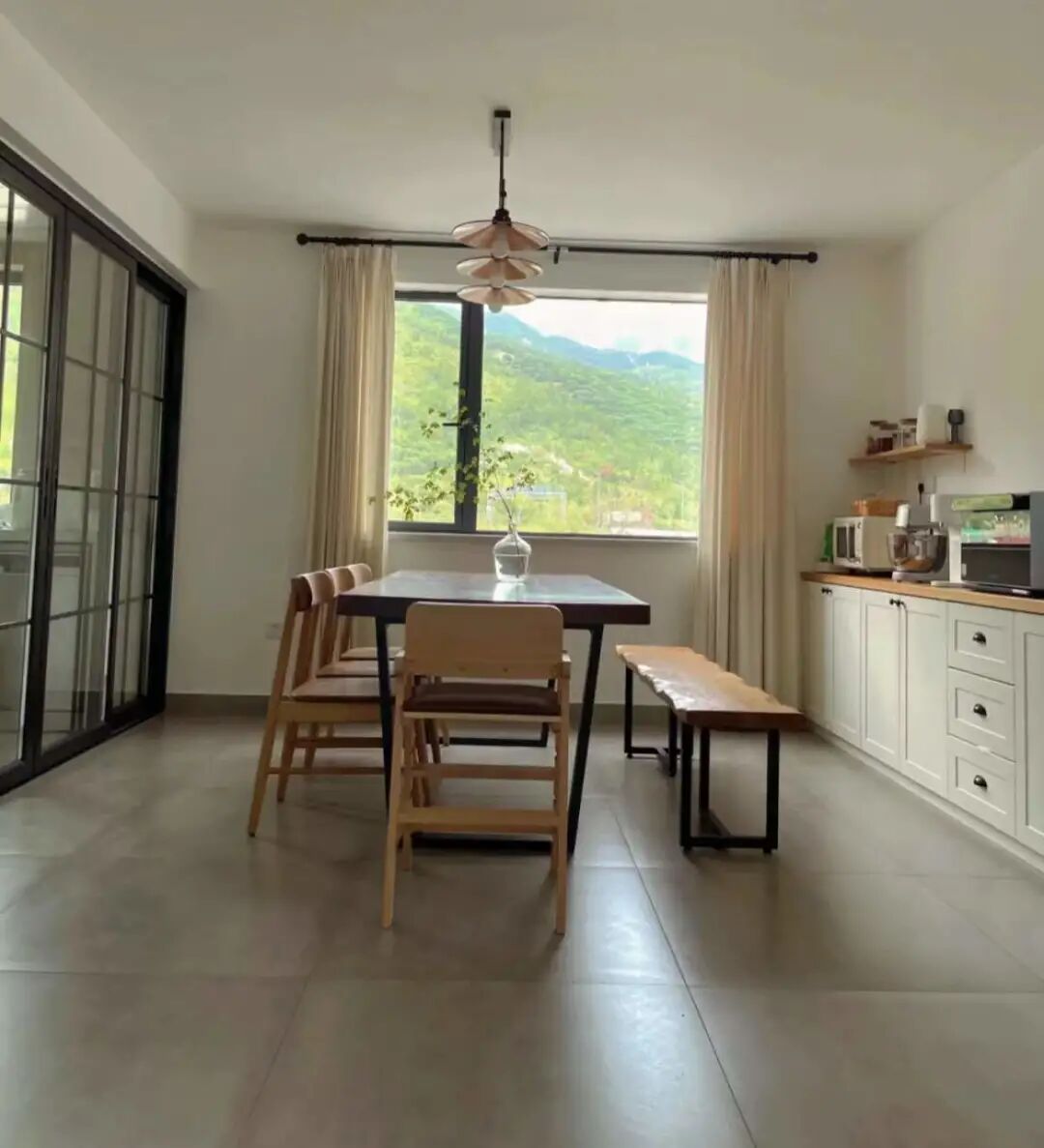 楼梯上去就是餐厅,简约清新,没有过多的装饰。但却是一个十足的山景餐厅,在这里吃饭山间景色一览无余。