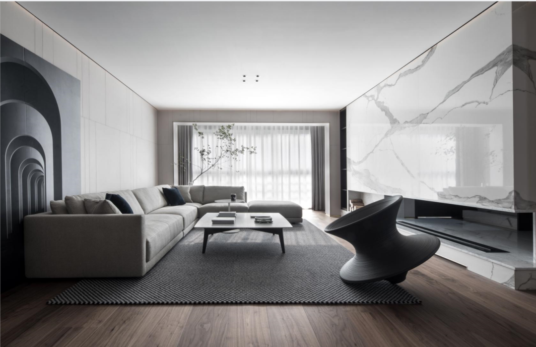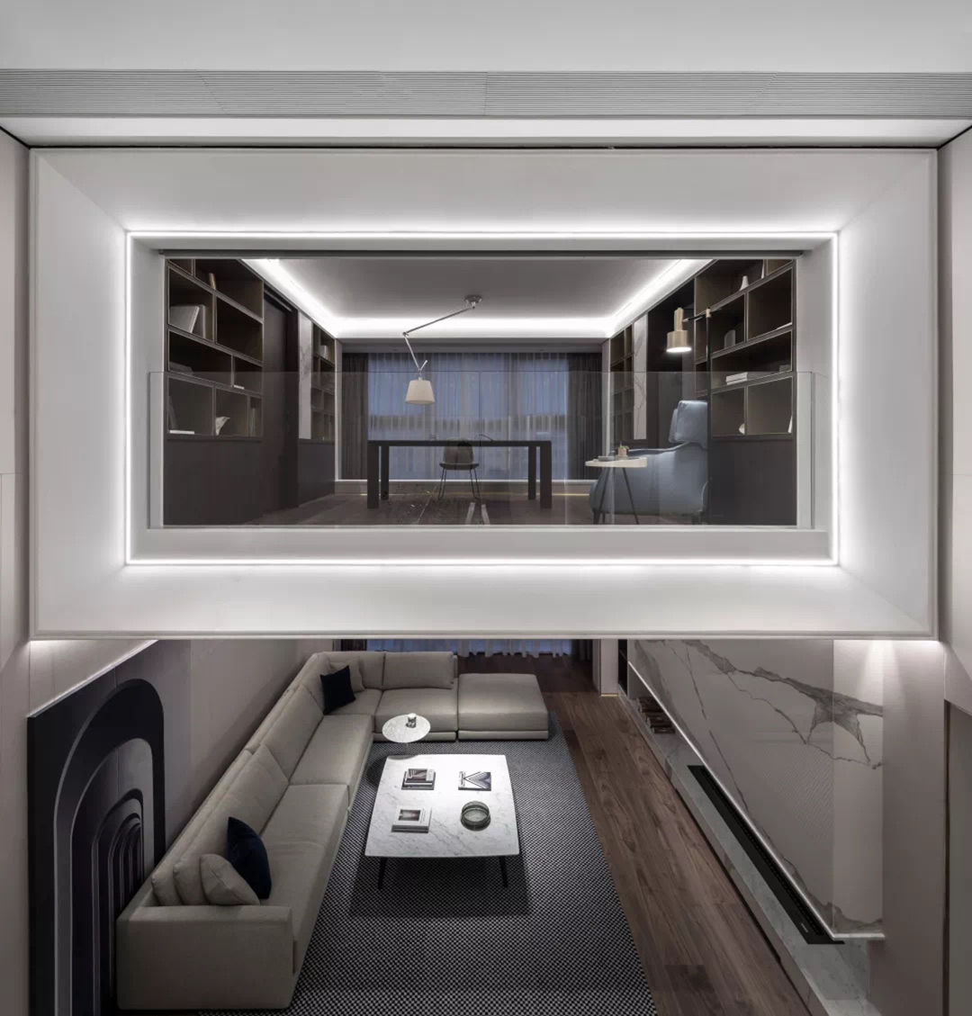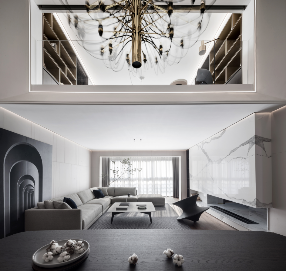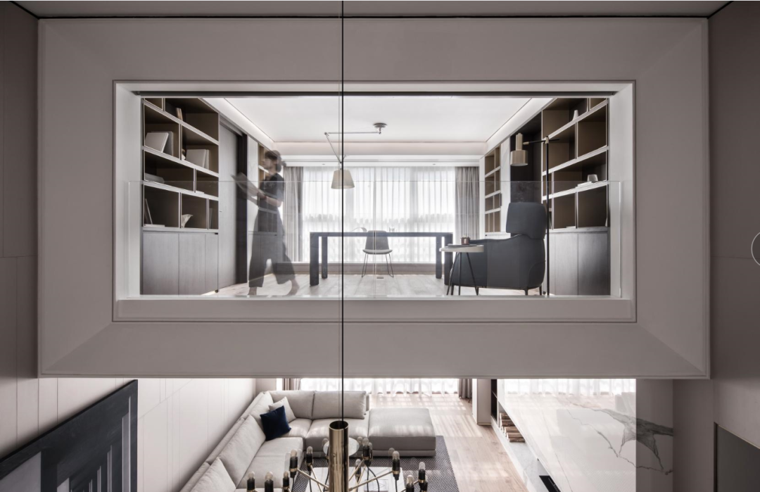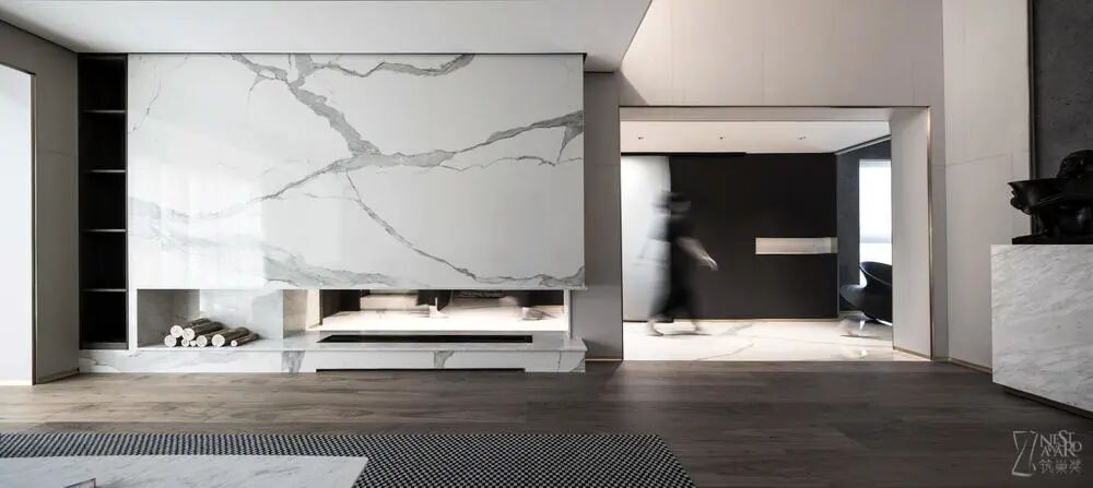 地面的大理石低调又极具张力的纹理,从回廊延伸到每个区域,提示空间应有的温度,一种现代摩登与含蓄东方并存的意趣,方寸之间感受精致优雅,空间关系恰到好处,是本案设计师最喜欢停留的地方。