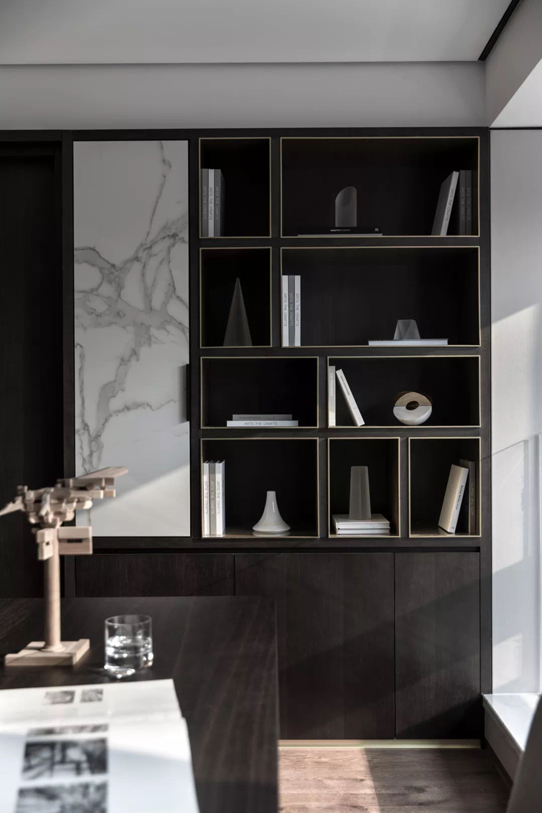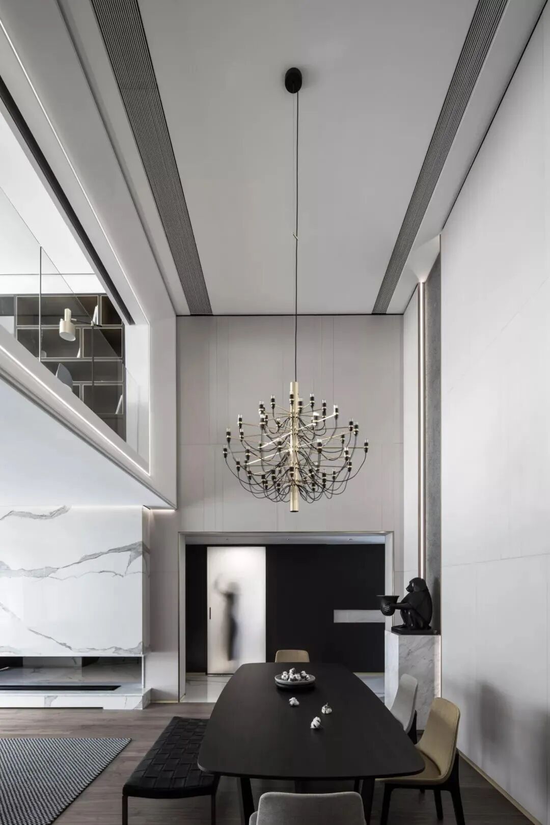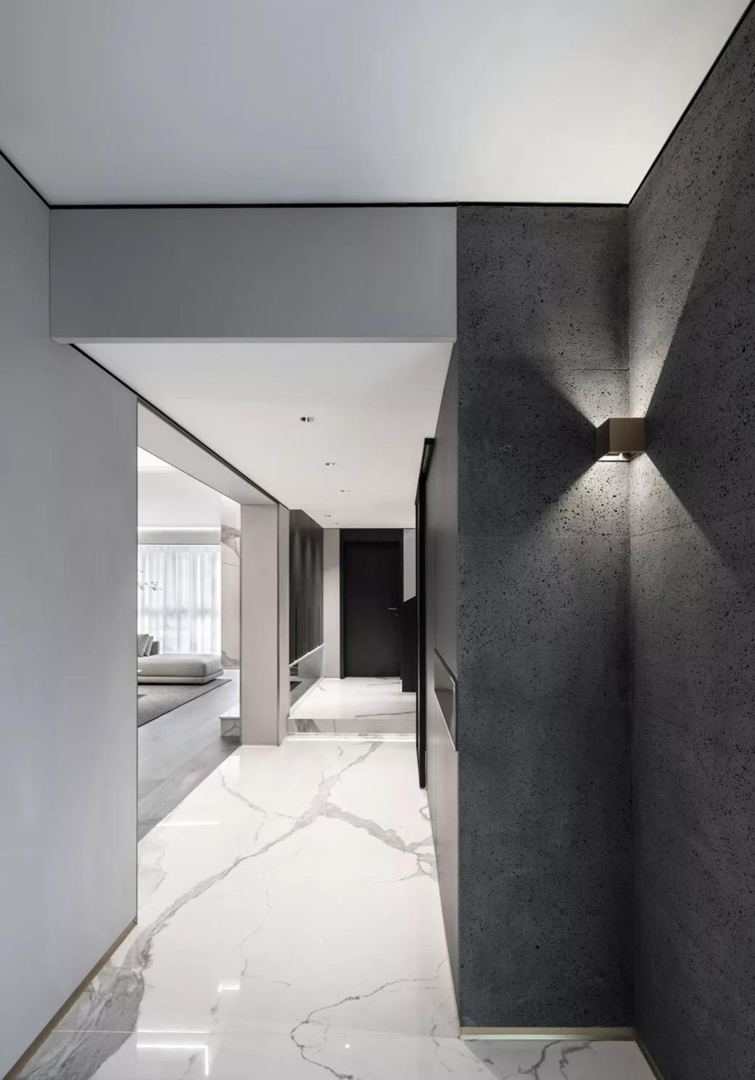 地面的大理石低调又极具张力的纹理,从回廊延伸到每个区域,提示空间应有的温度,一种现代摩登与含蓄东方并存的意趣,方寸之间感受精致优雅,空间关系恰到好处,是本案设计师最喜欢停留的地方。