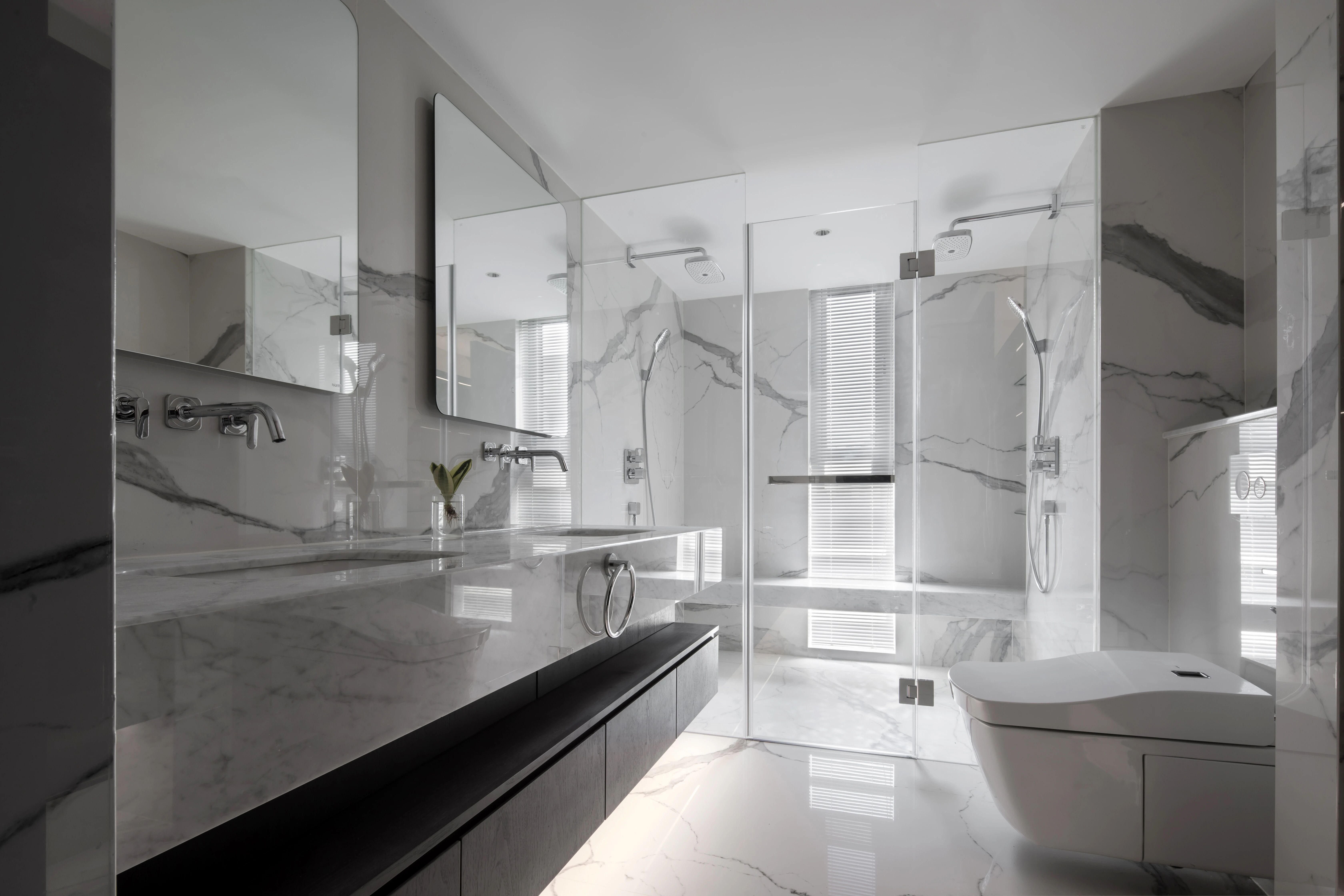 卫生间没有明显的边界感,虽然是干湿分离又好像融合成了统一的空间。无边框的镜子,纯透明的玻璃门,传统的黑白灰组合,简约却不简单。