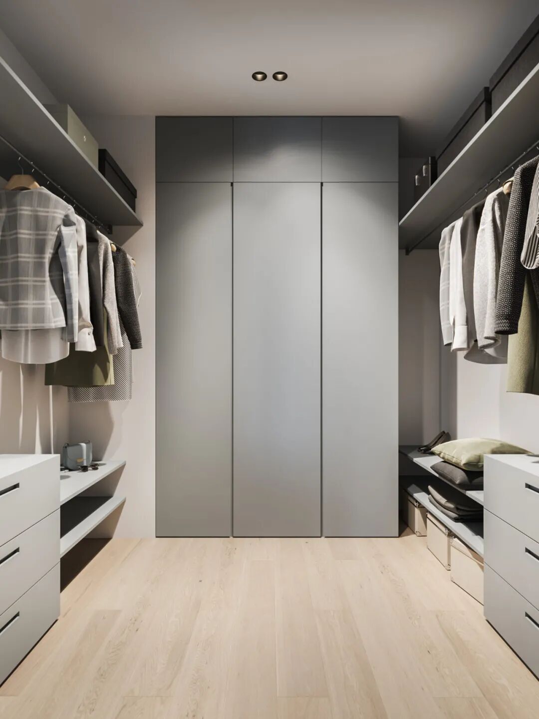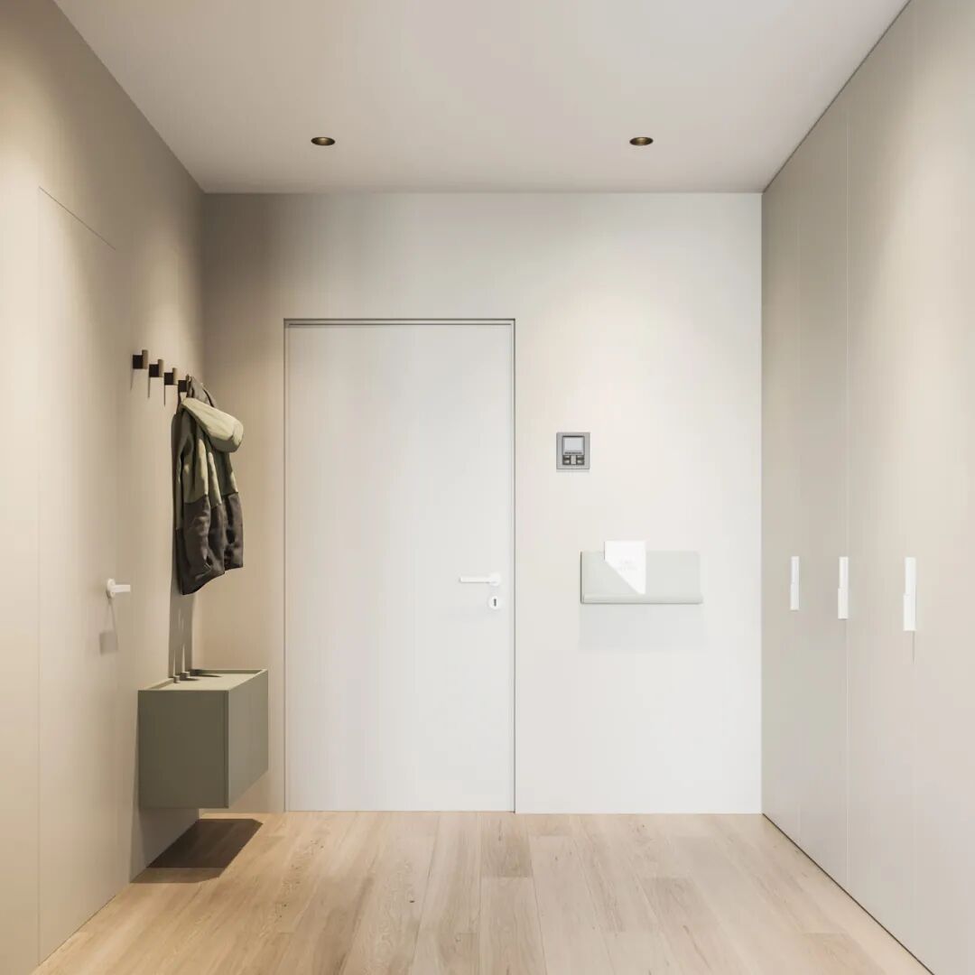 门厅部分同样化繁就简,悬空的门厅柜杜绝卫生死角,更显空间透感,通天衣柜与墙体一色,视觉上延伸了层高的同时也满足所有的储物需求。
