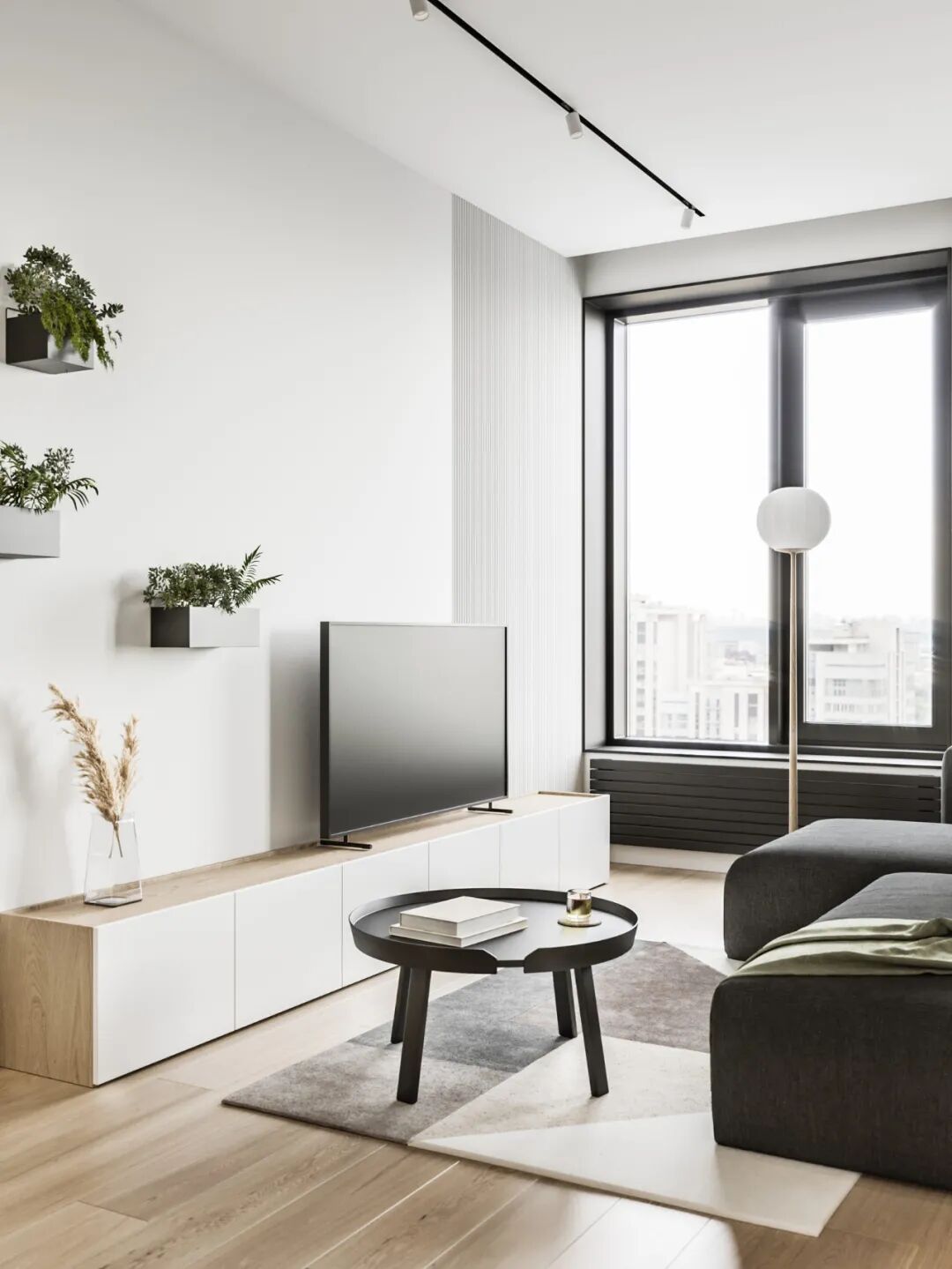 一推门入室,映入眼帘的便是两个南向的大落地窗, 给足了空间采光。为了不浪费双南窗带来的好阳光,设计师特意将窗户做了下延,不负满眼好春光。