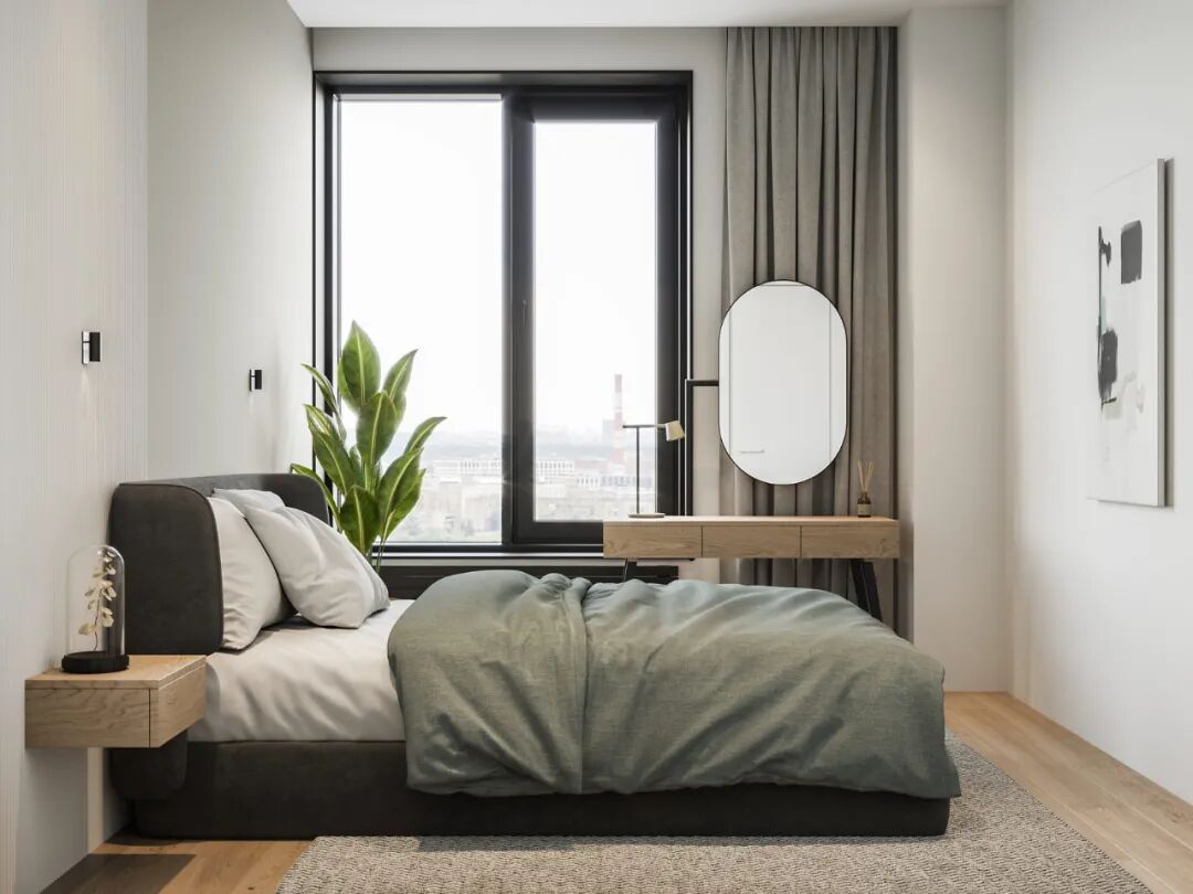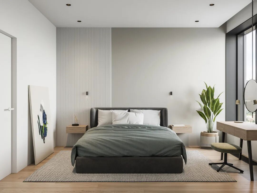 卧室同样延续简约不简单的设计风格:两张装饰画,一块编织毯。半包式床头的设计给足女孩子安全感,原木色床头柜同样悬空增加通透感,紧凑的户型加上温柔的配色,女孩子的安心,从一晚精致睡眠开始。