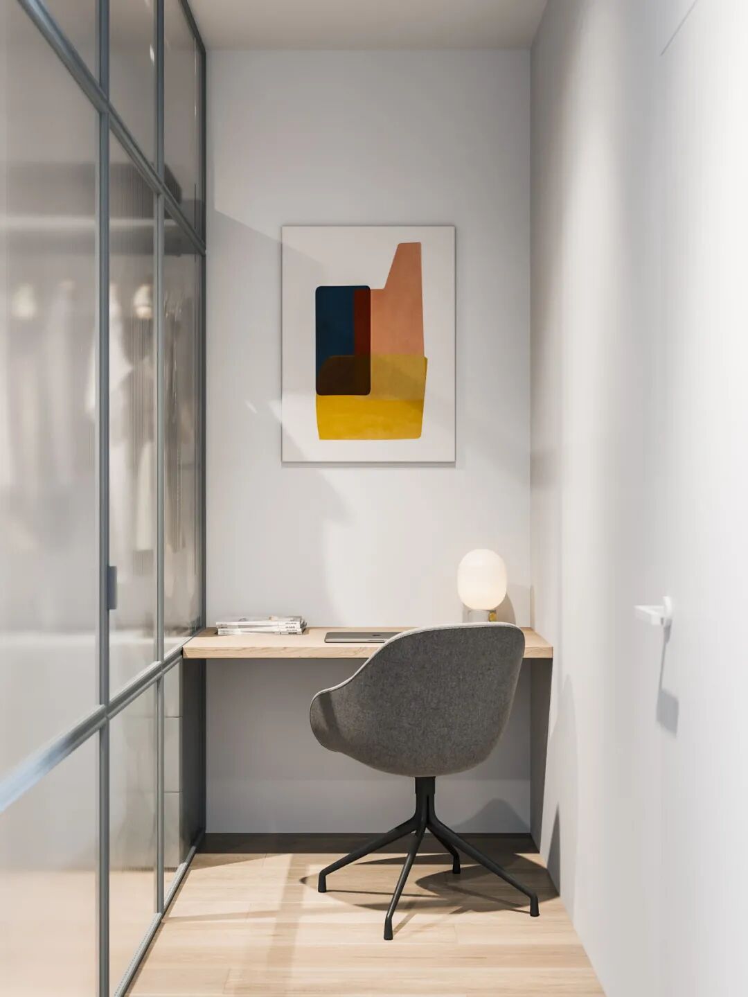 值得一提的是,设计师以精巧的玻璃细框门作为隔断,在客厅对侧为业主打造了一个小小的思考空间,窄条案,电脑椅,一点小分隔就足够点燃工作的激情。