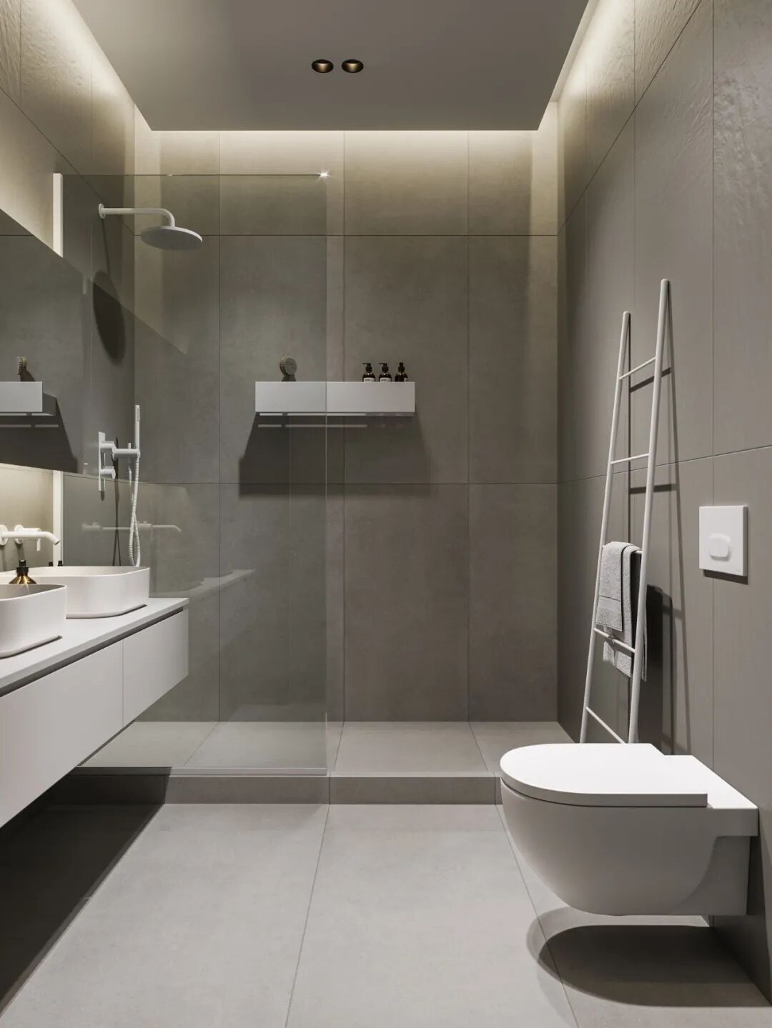 即使是一个人的空间,设计师也为业主做了双台盆的设计,既是自由,也是任性,洗手台和马桶采用悬空的设置方式,方便打扫还颜值满分。灰色磨砂瓷砖通铺上墙,安全低调也十分耐看。头顶的隐形灯带给沐浴也带去了别样风情。