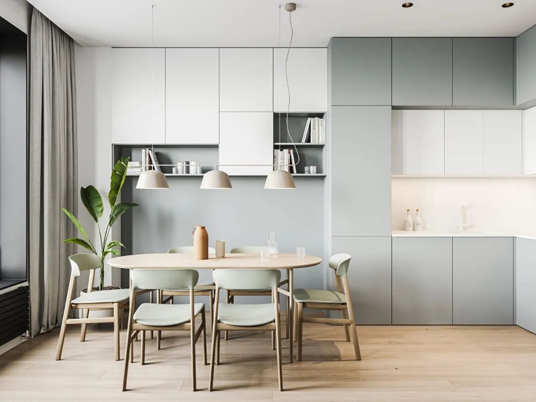 设计师将空间利用到极致,考虑到业主基本不做饭的生活习惯,便大胆地将书房的功能融入餐厨位置,置顶书柜连着橱柜,六人位的大餐桌也满足一个人的就餐、学习、办公等实际需求,融合巧妙,高效实用。