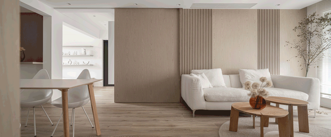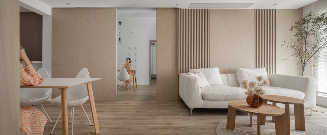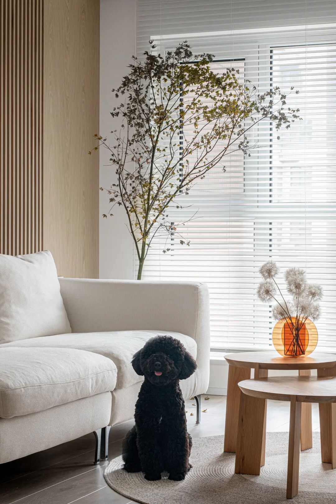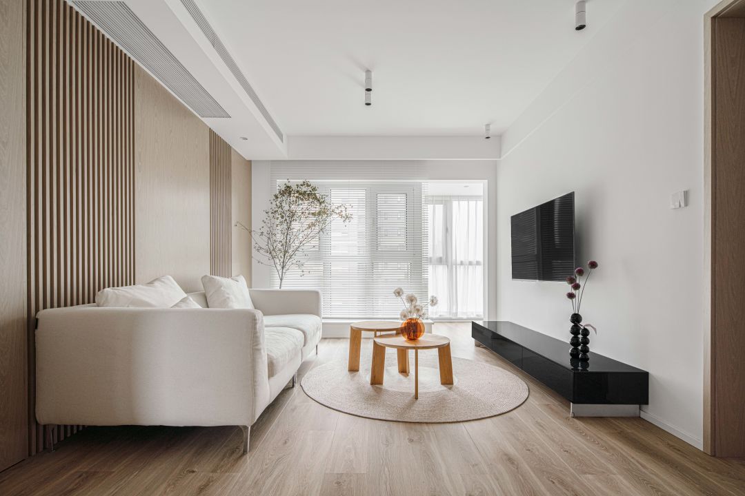 客厅的软装上,同样延续了木色加白色的搭配,奶白色的沙发,木质的茶几,都让空间多了几分原始的纯净之感。