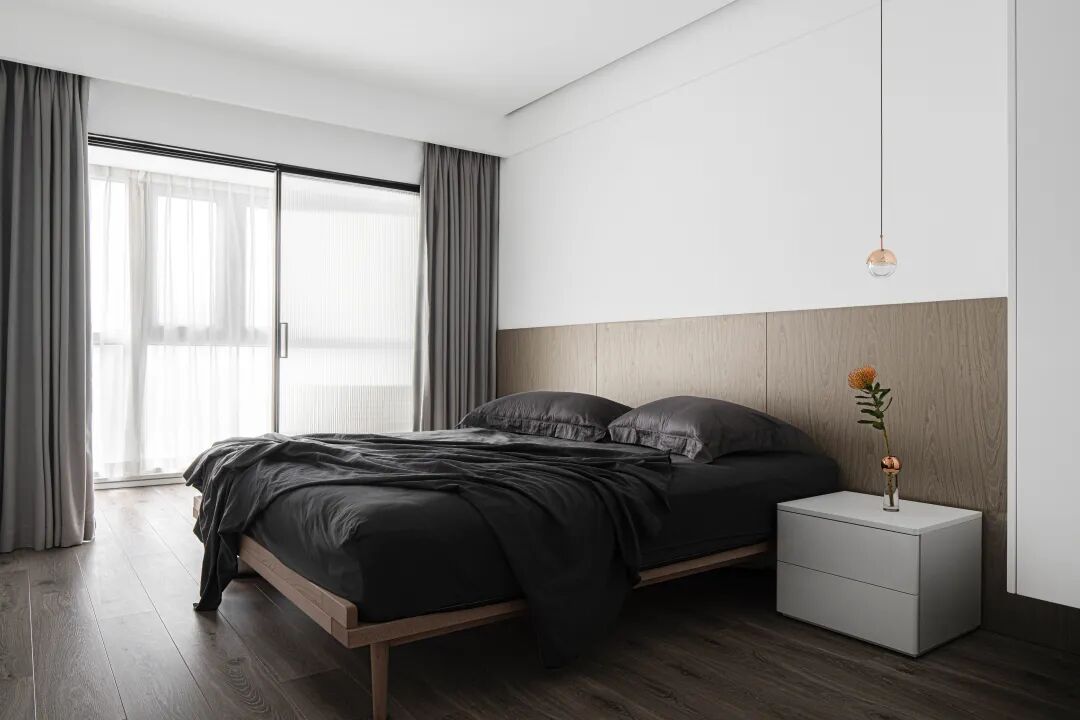 主卧打掉了原户型的一面墙来扩大有效实用面积,打开长虹门阳光倾泻而下,打在身上暖意十足,也使卧室阳台融为一体,而当强光出现时,长虹门会轻轻拖住光线并柔化,使柔光散入各地。