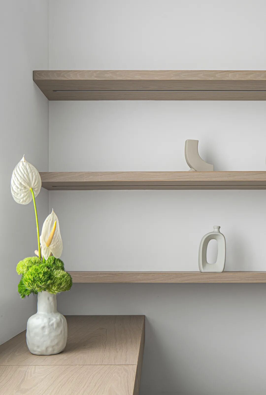 墙面上突出的几个正方体装饰,加上不规则的石膏漆涂抹,使大片的白色墙面不在单一,生出一种自然随性。