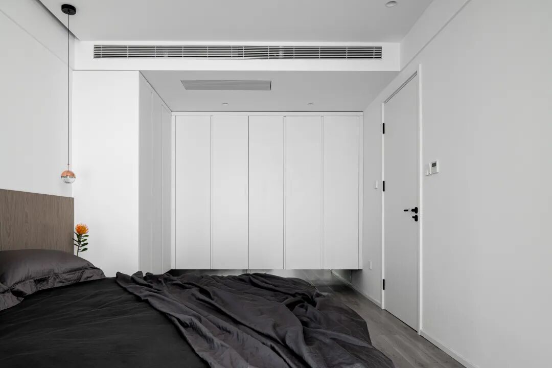 墙壁上做了一排悬空衣柜增加储物。卧室衣柜下面沿用客厅的设计,增加了镜面来扩大空间的视觉感,让整体空间有一种无限延长之感。
