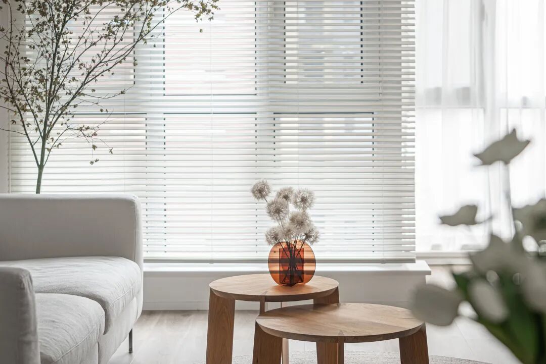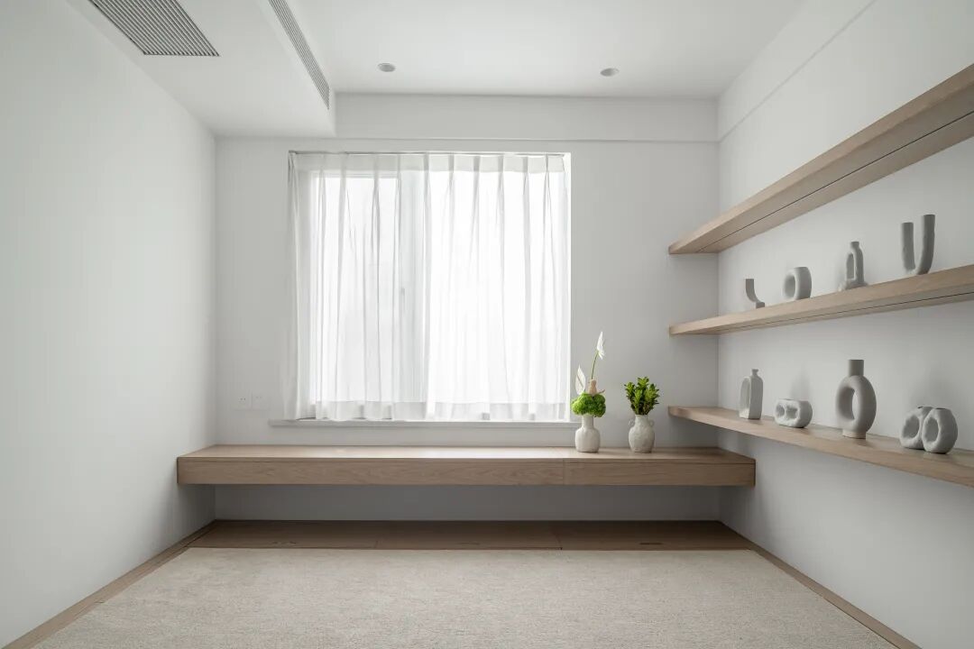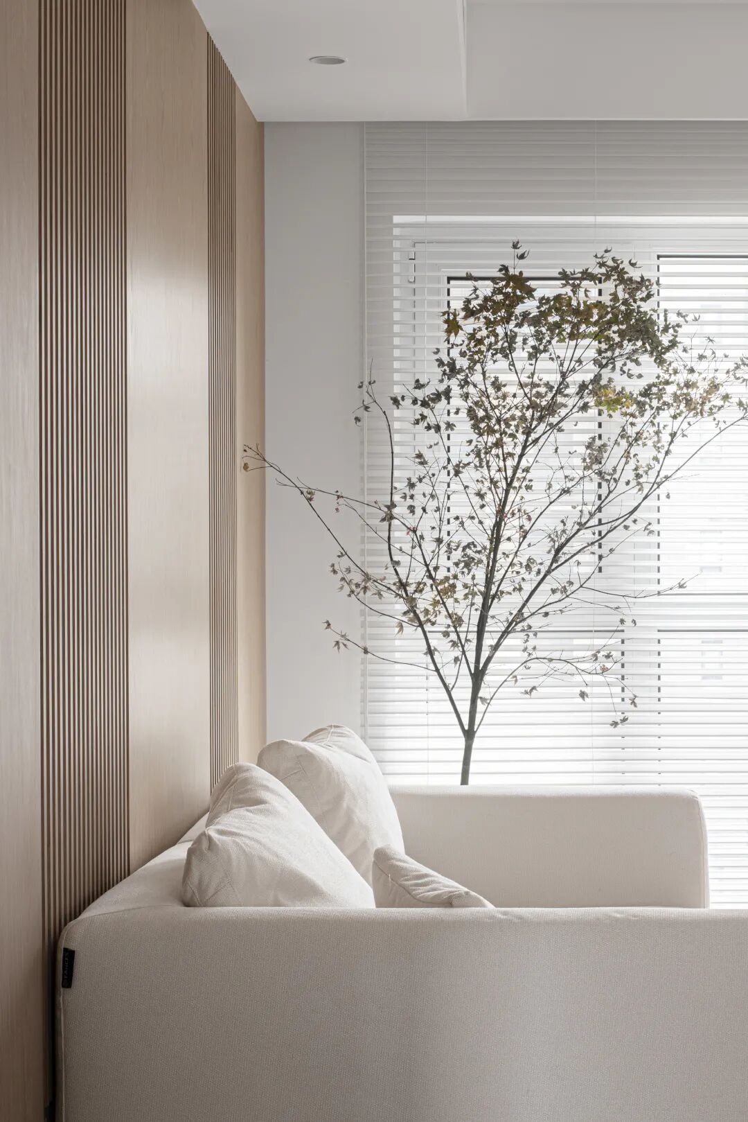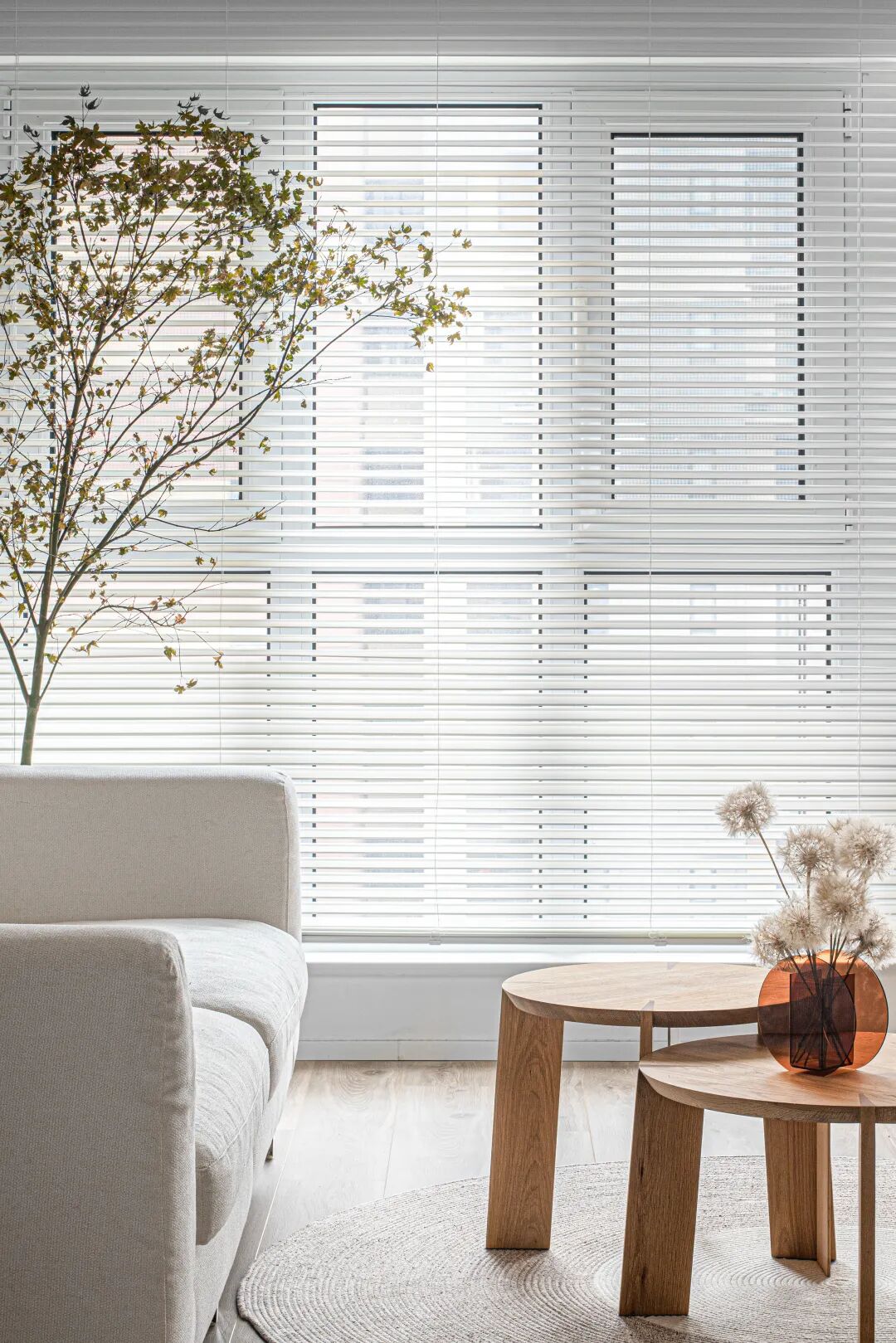落地窗以白色窗框为主要元素,使用百叶帘保证透光,使整体空间更加通透简约。