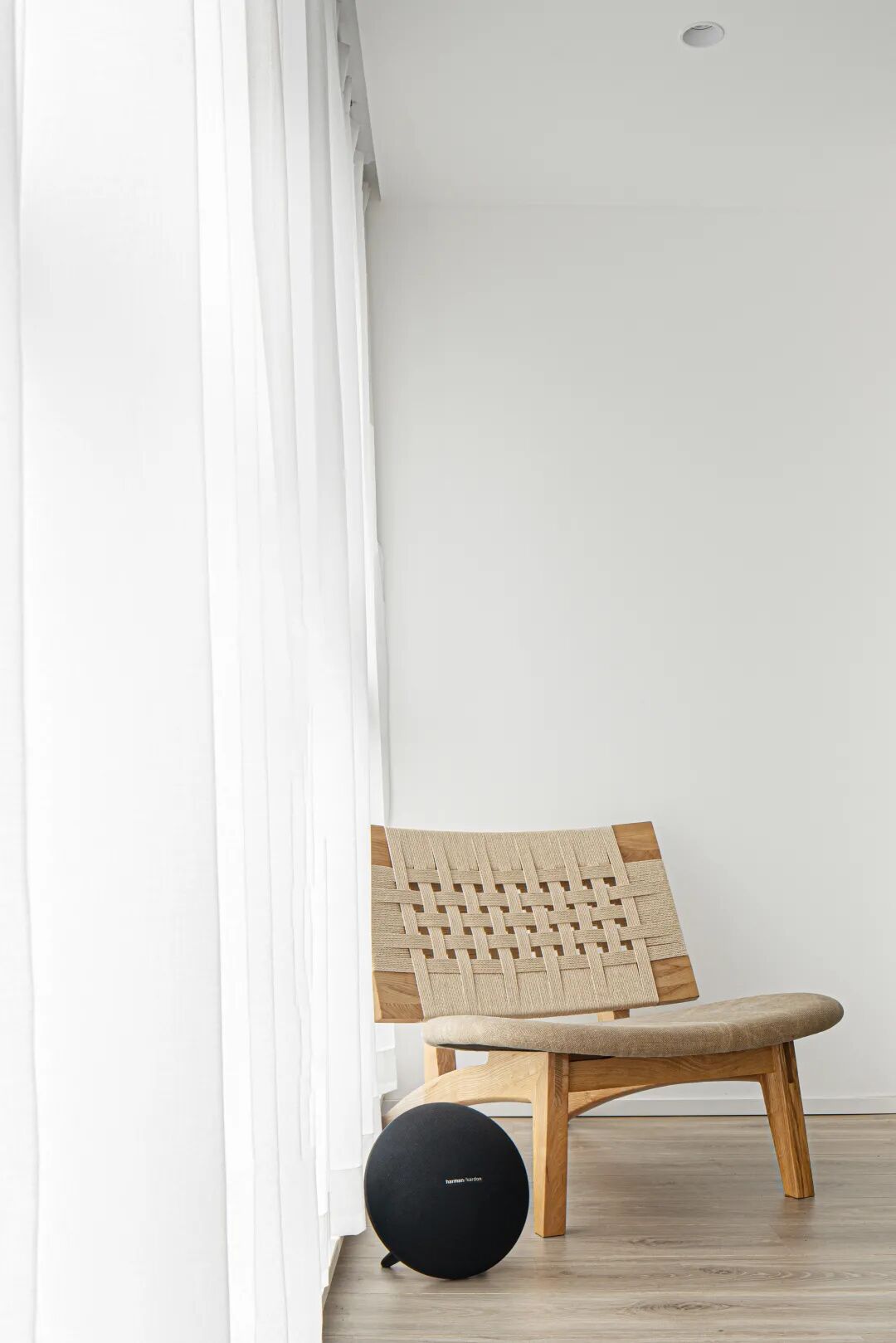 旁边的阳台位置,运用飘逸轻盈的白纱窗帘,摆放一个木制布艺的矮凳,偶尔坐下对着窗外景色喝杯茶,也是很不错的选择。