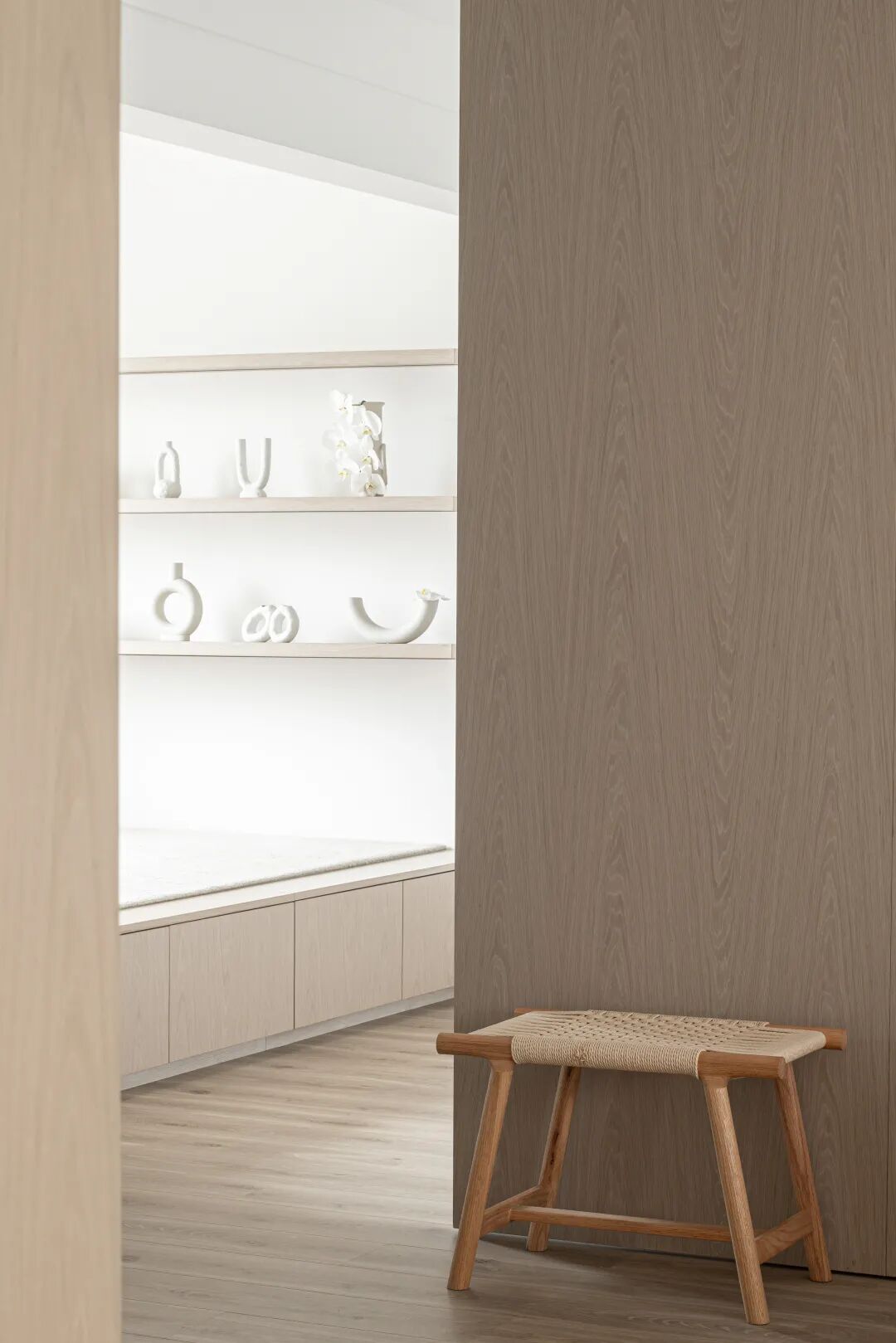 隐藏推拉门背后就是一个榻榻米房,是原入户的次卧改成,改造之后增强了入户区域的采光,也满足了男业主想拥有一个在家办公的场所。同时也可以作为父母、好友拜访时的休息之地,而推拉门的设计使得这部分空间可以灵活的在静谧和开放之间转变。