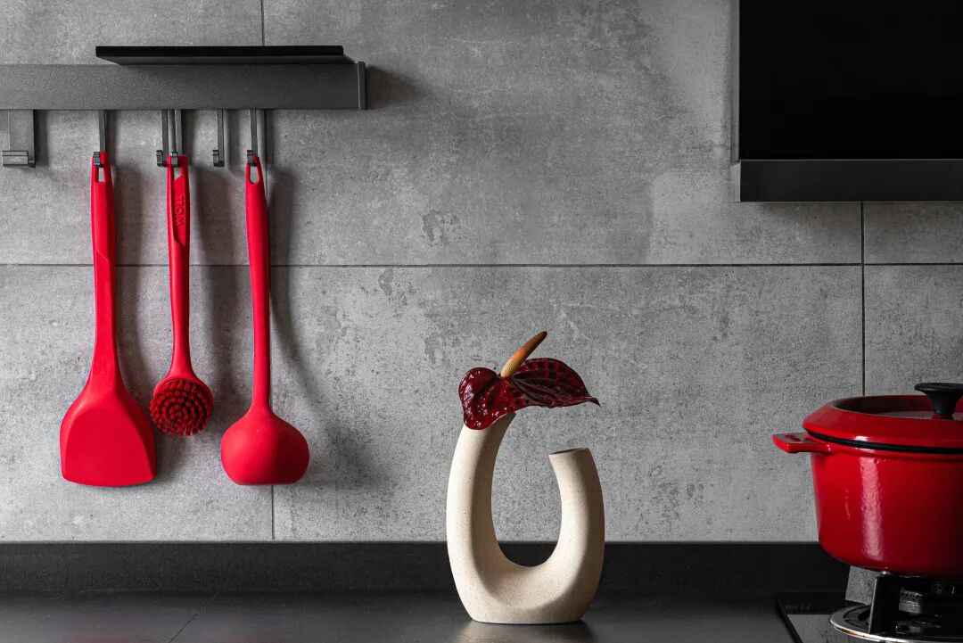 厨房应该是整体颜色最靓丽的地方了,灰色的墙面,黑色的灶台,加上红色的厨房用品,让厨房这个充满烟火气息的地方,多了些野性的味道与时尚感。