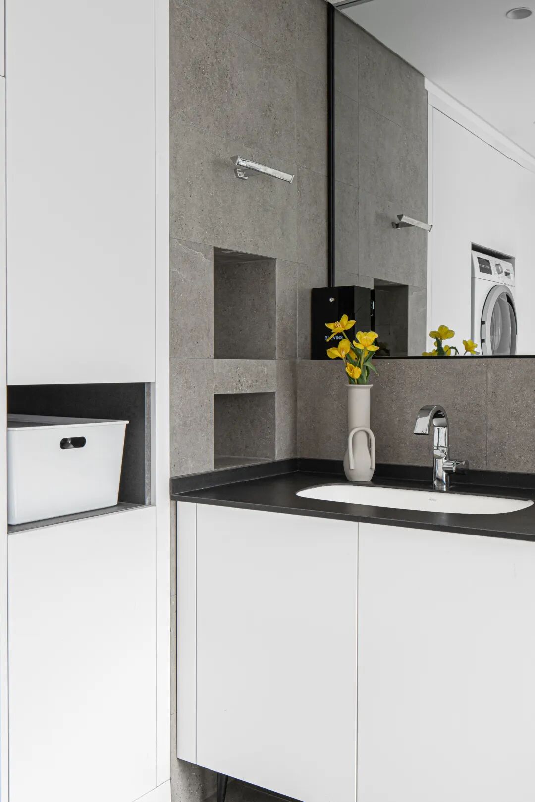 卫生间是由另一间卧室改造而成,不仅扩大了使用面积,而且更加宽敞明亮。灰色的石材做墙壁提升了整体质感。
