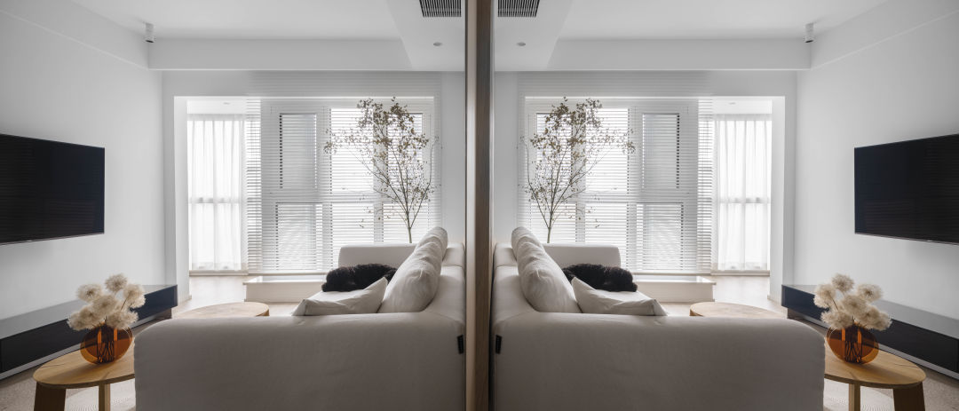 沙发后侧的镜子是可以隐藏在推拉门里面的,满足业主日常着装实用需求,这个设计也通过镜面在视觉上扩大了空间。