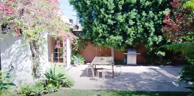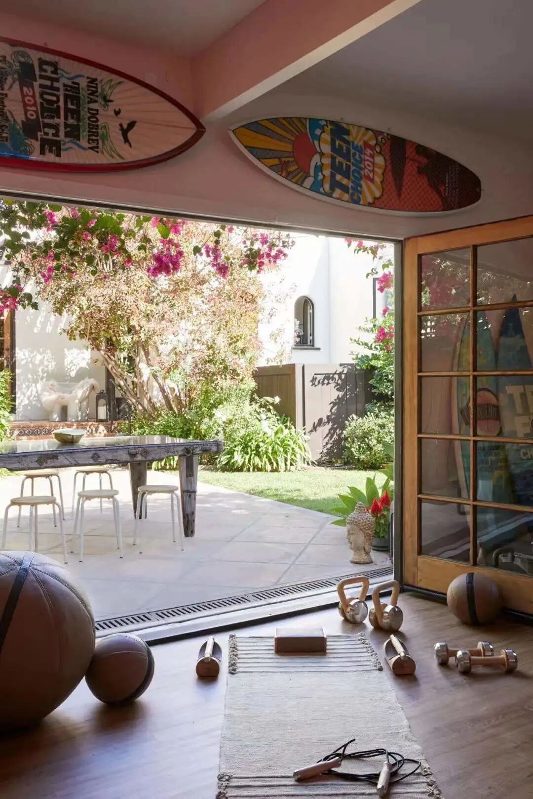 多功能室正对着院子,庭院里简单摆放着桌椅,可以在闲暇时光和朋友喝杯咖啡。满地的健身器材,门后以及门梁上的冲浪板都能看得出妮娜很爱运动,所以说,好的身材都是自律的结果。