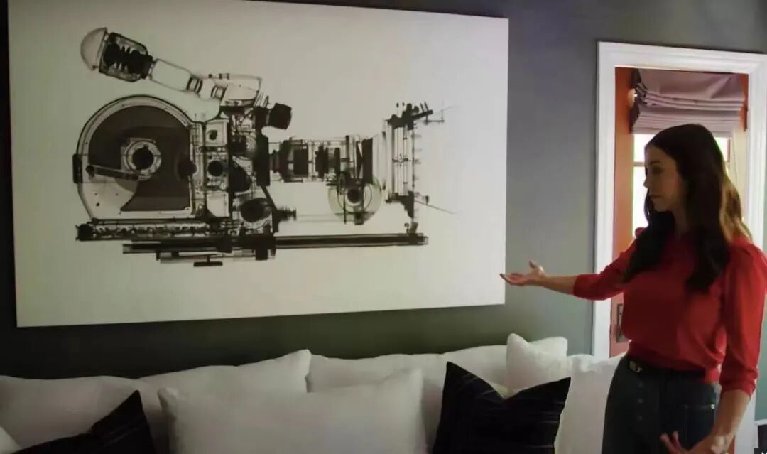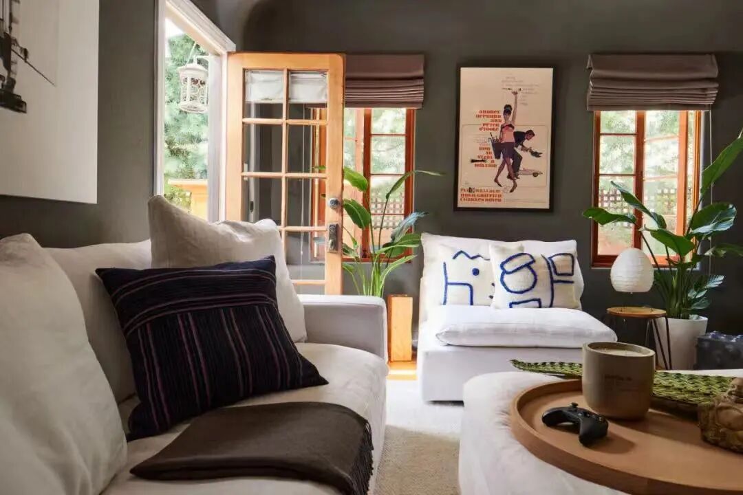家庭影音室与客厅颜色不同,采用深色系的墙面增加复古感。窗子和门上都装了深灰色的拉帘,方便营造更好的观影氛围。沙发背后的老式相机挂画,则是作为画家的妈妈亲手画的。