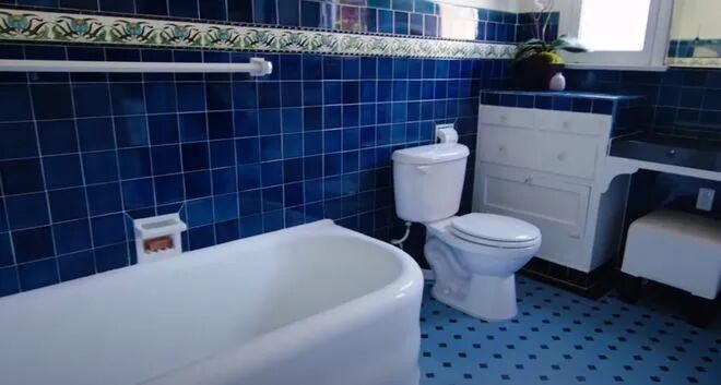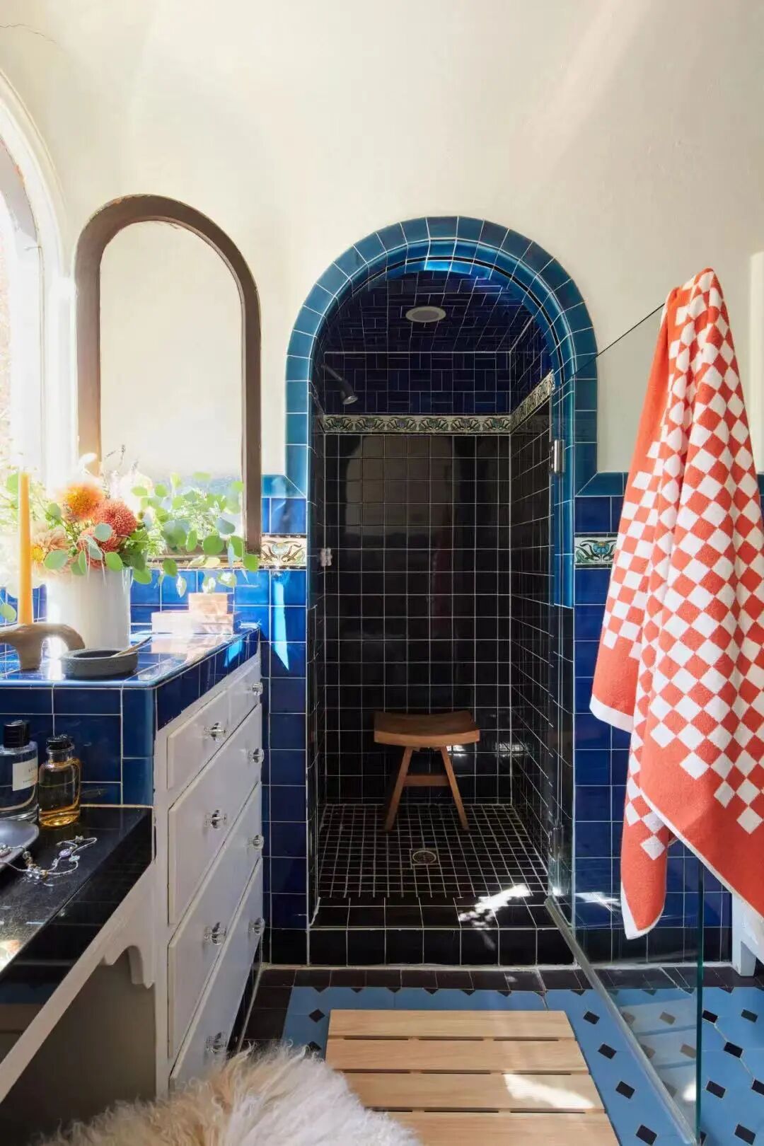 西班牙十分喜爱鲜明的颜色,特别是红色和蓝色,作为西班牙风格的老宅,卫浴间运营了大量的蓝色马赛克瓷砖,看上去深邃又自由。