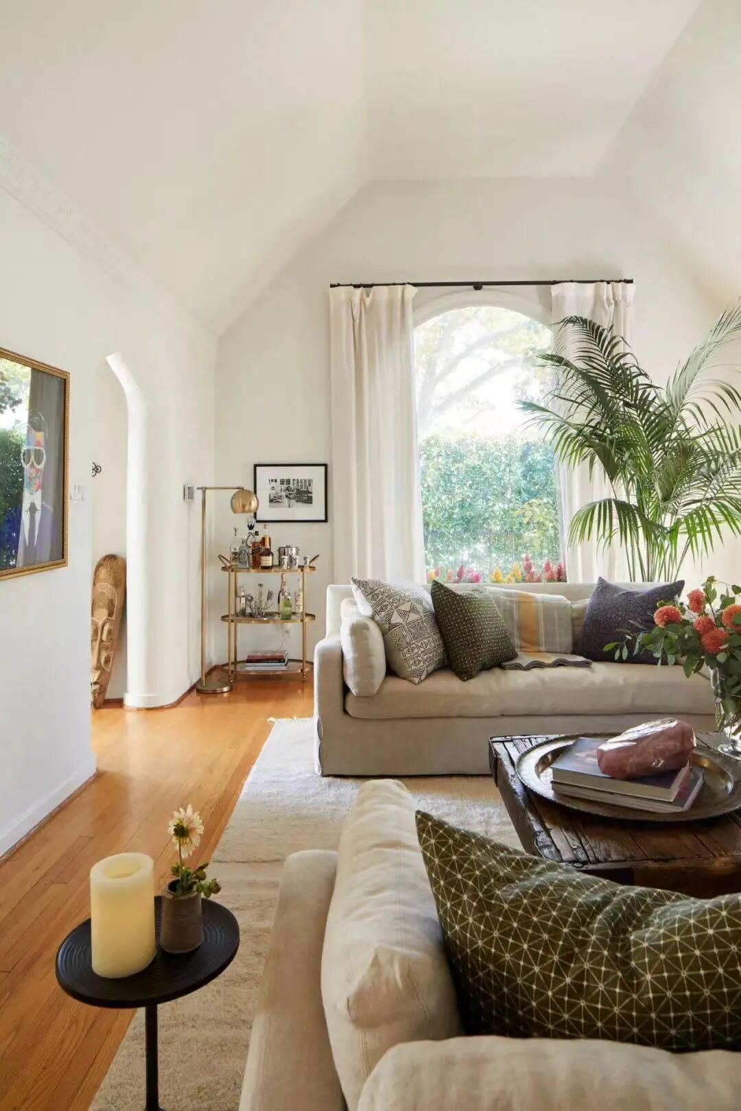 室内的绿植,与室外的植物相呼应,整体空间清新自然。没有过多的颜色,墙上的每一幅挂画、桌上的每一张照片都充斥着生活气息。