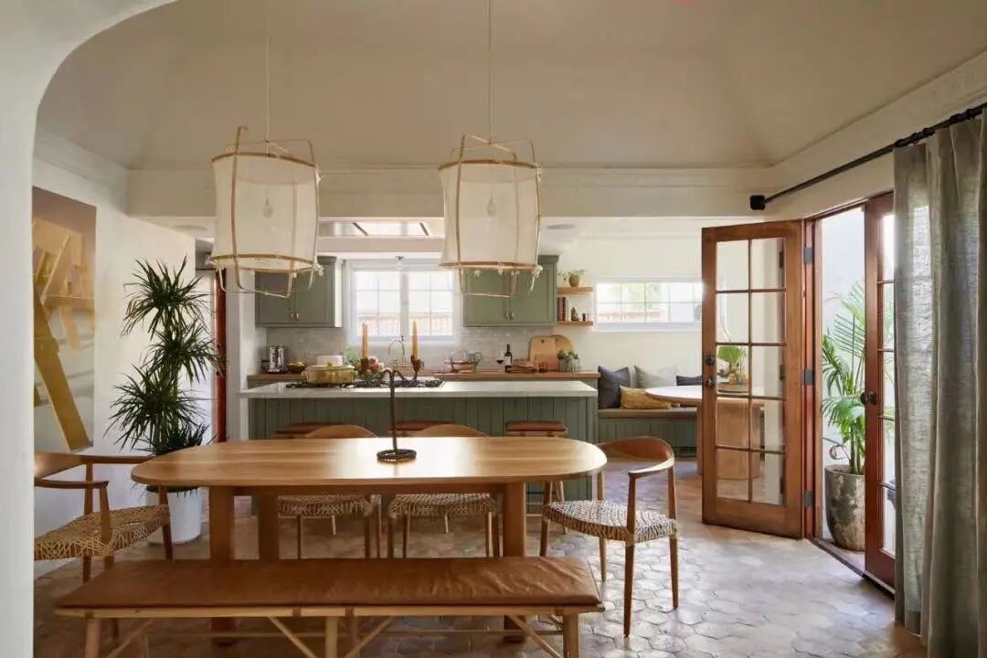 客厅和餐厨之间原本有面墙,打破原有的阻隔,开放式的餐厨与客厅相连。木制的桌椅与复古的六边形意大利瓷砖相得益彰,橄榄绿的橱柜,加上白色的大理石台面,干净清新。