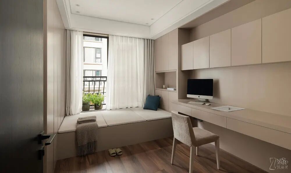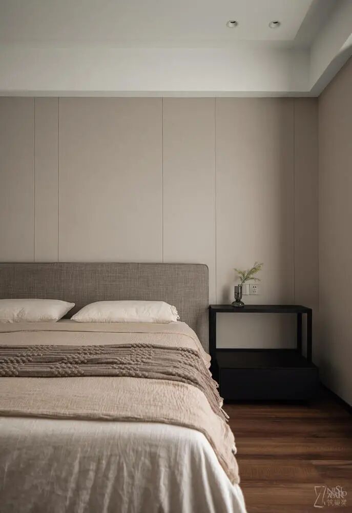 营造一个安静、素雅的卧室空间有助于提高居住者的睡眠质量,满足收纳功能的同时,用材用色尽可能的协调过渡,不过度设计。