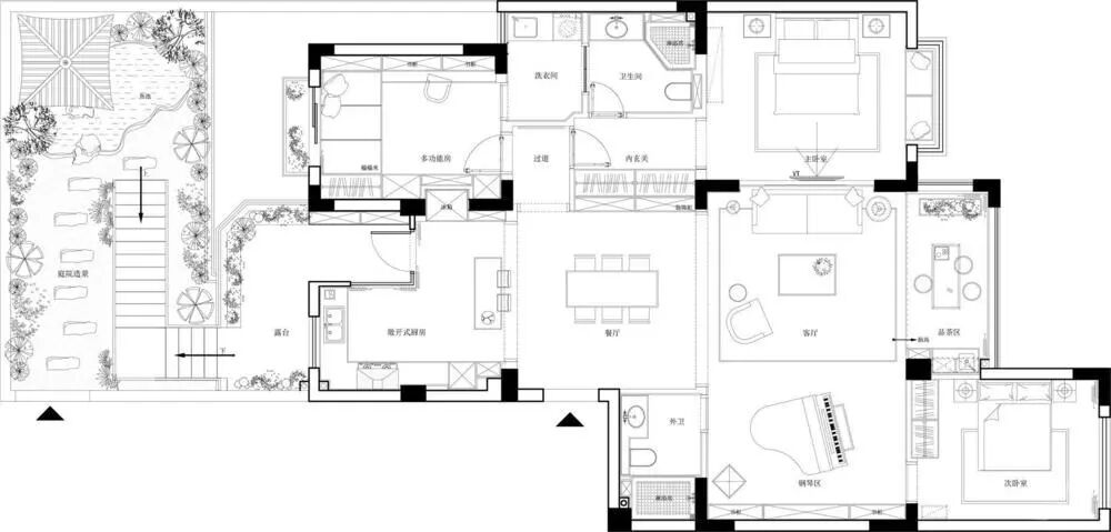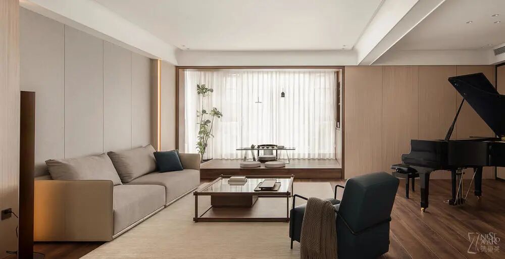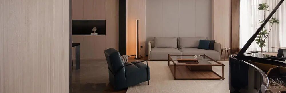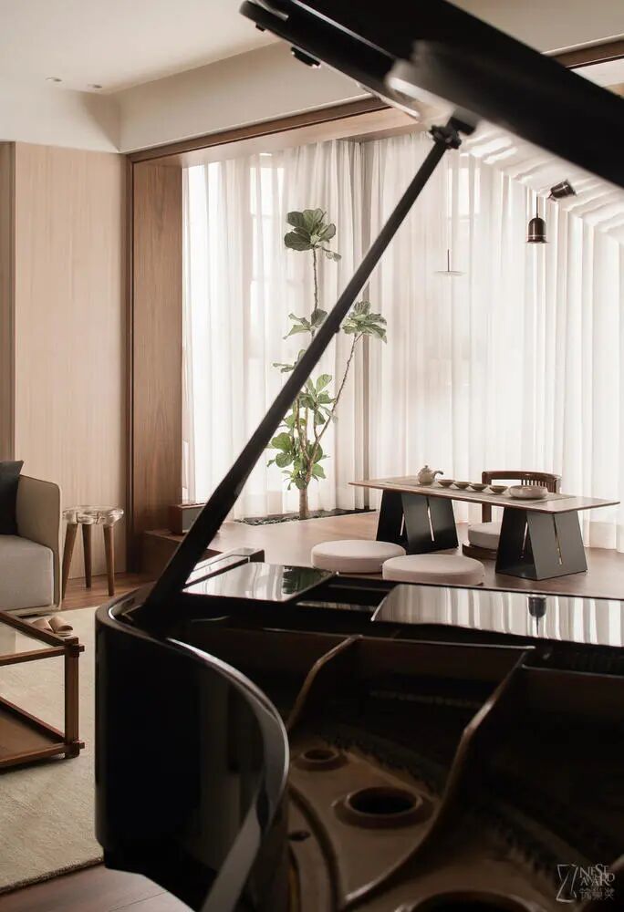 大尺度的空间摆放三角钢琴看似随意的添置,为空间增添不凡的艺术气息,整体空间理性中不乏精致。