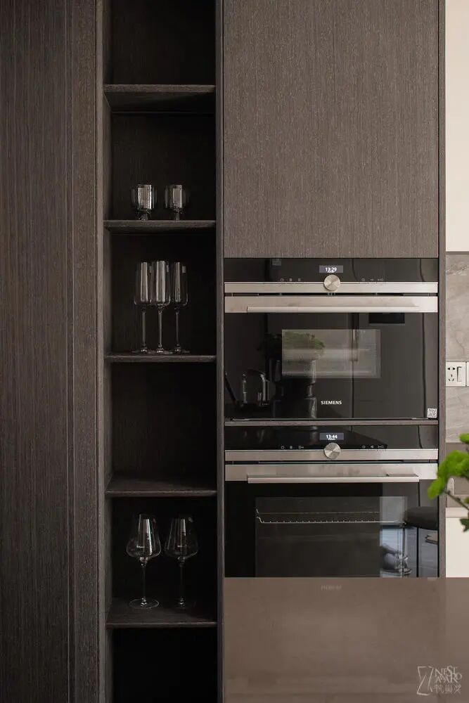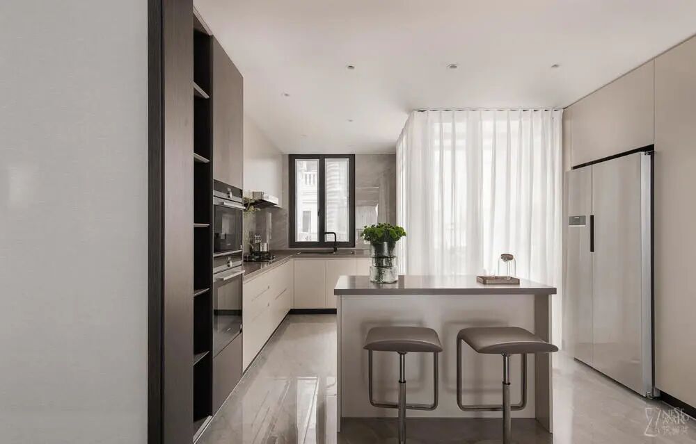 开放式厨房的空间布局纳入更多自然清气,透过大面积的落地窗使空间通透而明亮,烹饪的同时又能欣赏庭院的秋色。