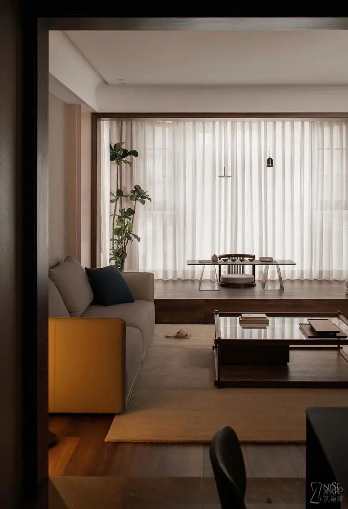 空间色调主次分明,冷暖谐和,闲适的空间,让人无比放松舒适。阳光透过窗帘,又带来些许暖意。