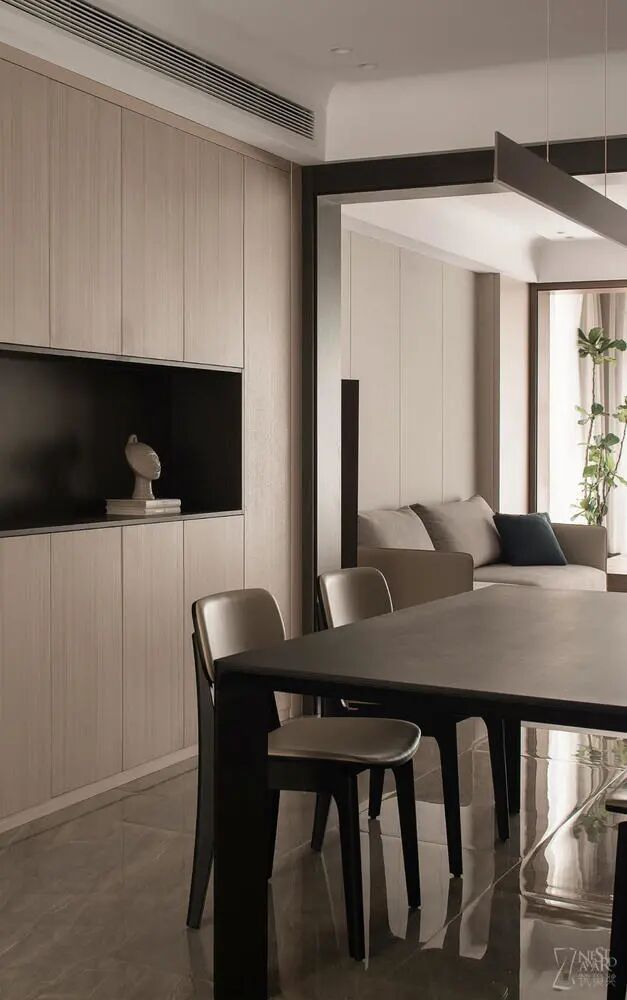 餐厅以双色收纳柜背景划分出与客厅的界线,两种差异化色调在对比中形成有趣的空间对话。