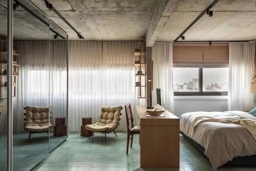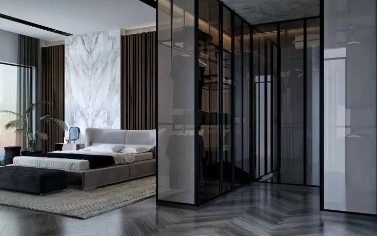 灰镜与茶镜做成70厘米宽的大面积的推拉滑轨门遮盖柜体,增加光线反射效果,减轻柜子的存在感,同时起到放大空间的视觉效果,你完全可以尝试一下!