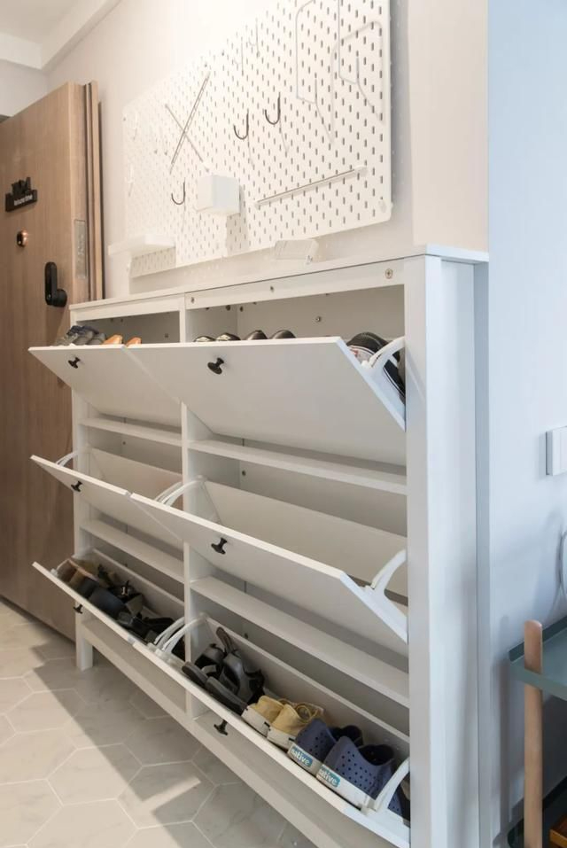 对于小户型来说,入户鞋柜太大占空间,只要将家里的柜子尺寸稍微改变,收纳、空间感统统可以满足;虽然每个空间的柜子都有其既定的深度、宽度,只要秉承柜子做窄“10-15公分”或者按照空间定制即可,既提升家中的收纳量和实用性,同时还增长了小户型的格调。