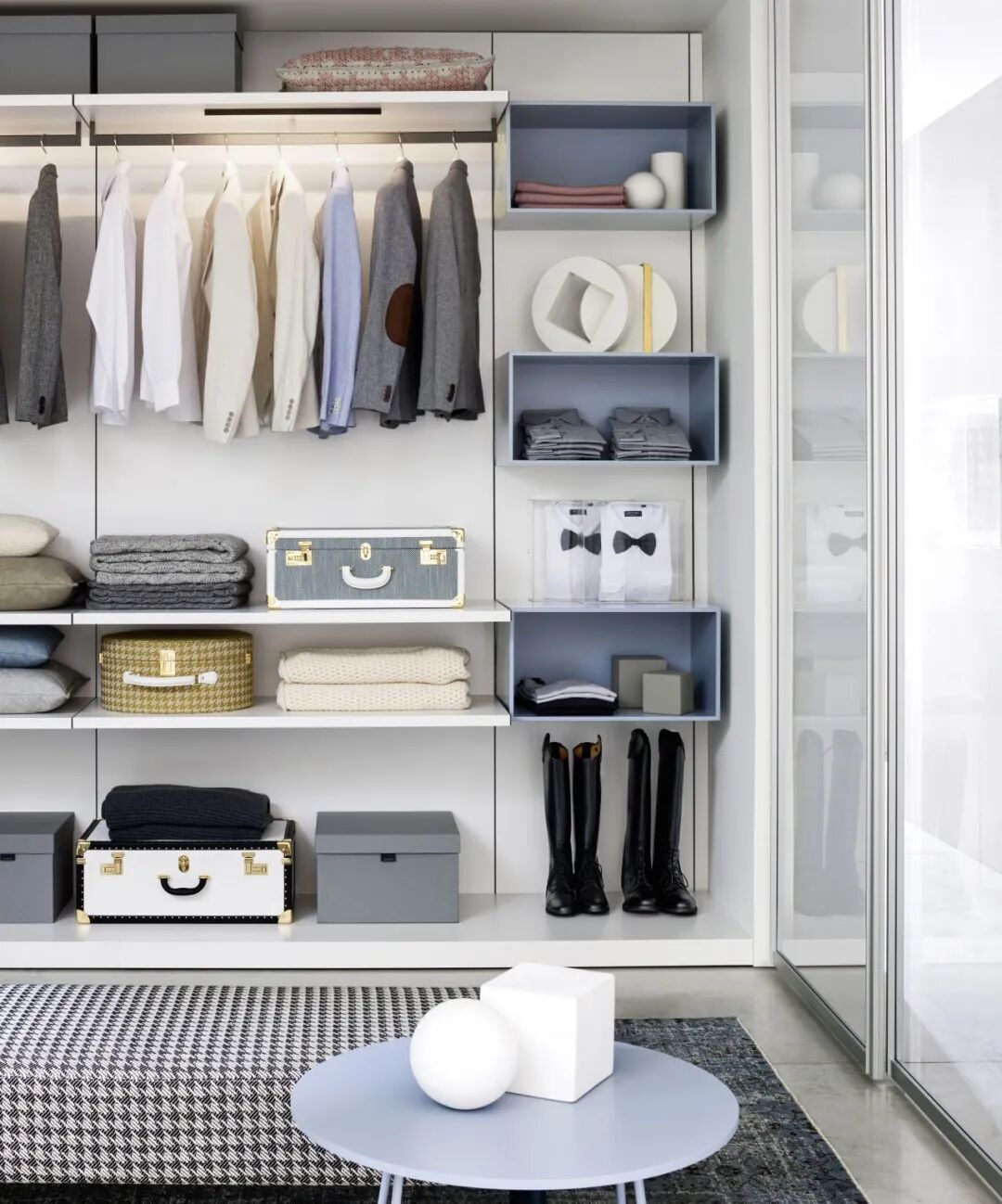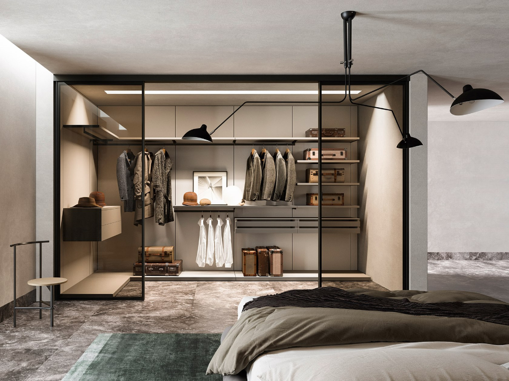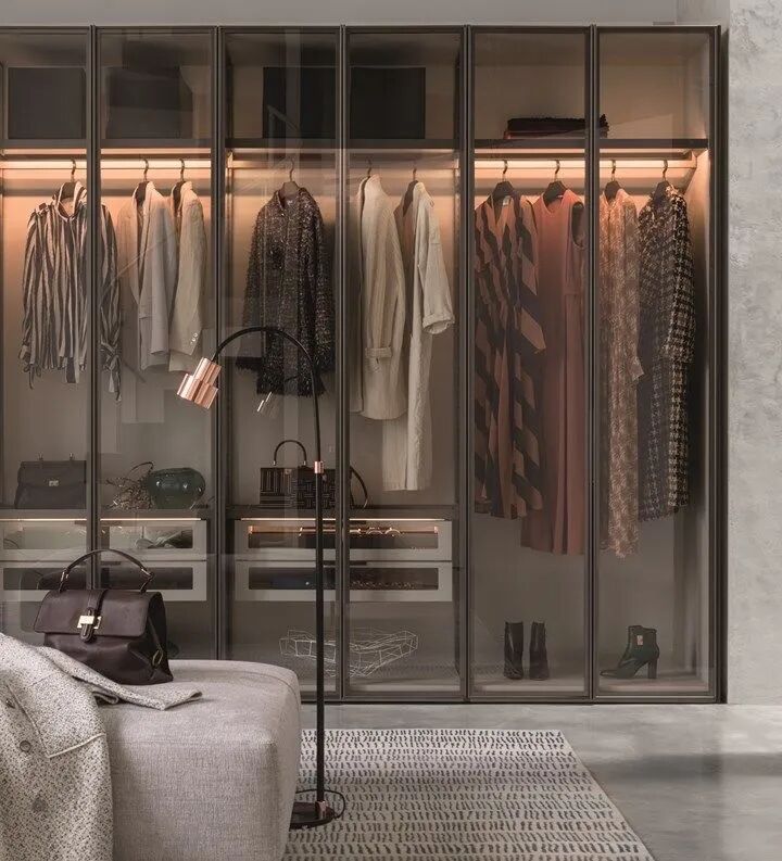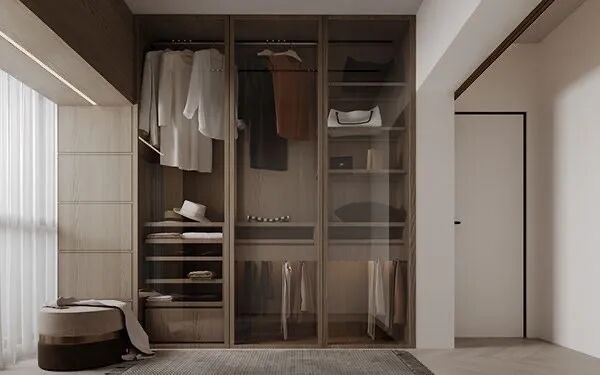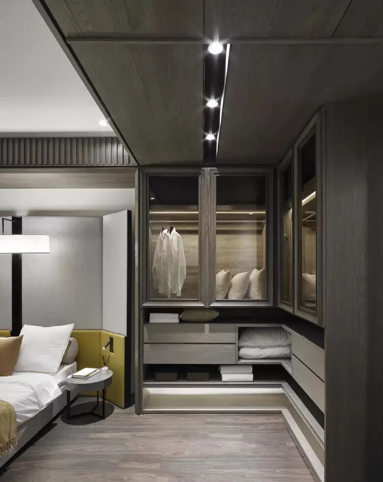 屋内的拐角处也可以设置迷你衣帽间,嫌衣物乱想遮挡的话,可以设计玻璃柜门,防尘又美观。