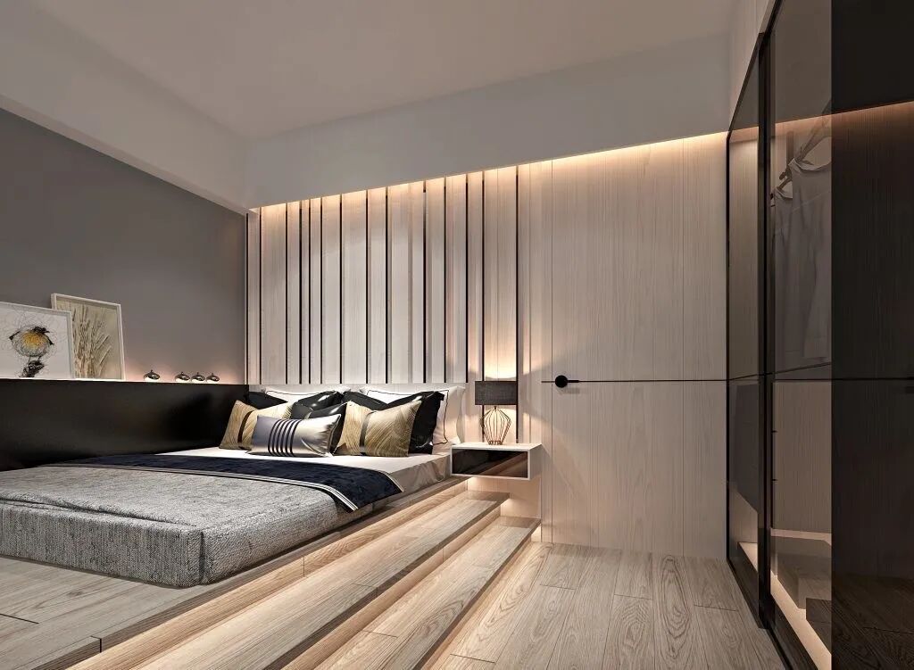 我们可以不用特意去固定卧室、衣帽间、卫生间等空间之间的界限,开放式的格局让空间设计更自由,空间的幸福感也更强。