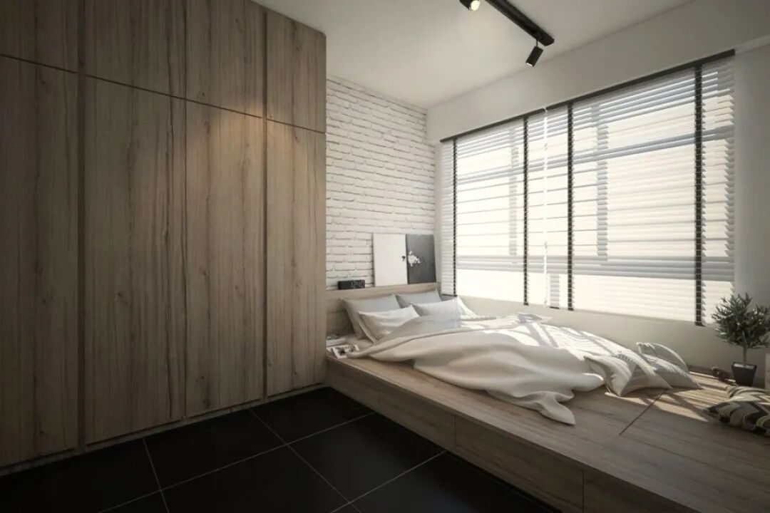如果卧室不够宽,可以将床设计成地台床,另一半用来放拐角式衣柜。