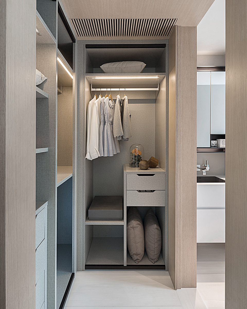 柜内灯是很好的选择,不占多余空间,还能营造丰富的层次。在衣帽间有化妆需求的女性朋友,应选择亮白色灯光,这种灯光下的妆感最自然。另外,低于3500k的光源易产生色差,选错衣物就尴尬了,建议选择3700k-4500k的灯具。