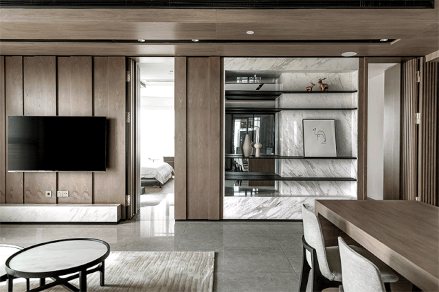 隐形门近几年有多火已不需再过多赘述,门与墙面使用同种材质、纹路和颜色,从视觉上保持统一,达到隐形于墙面的目的,与各种风格搭配起来都不违和,保持空间整体性的同时还增加了开阔感。
