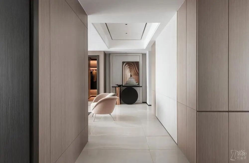 家用电梯出口正对玄关,我们利用碎片化的空间精心打造出“端景”。通过不同的重叠,提现线条的协调及延伸感。