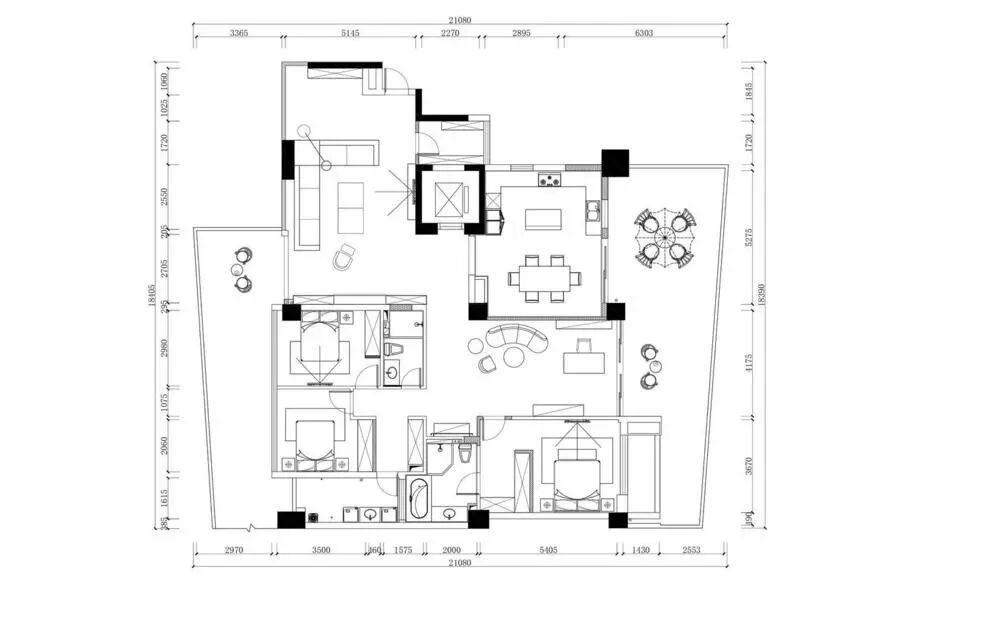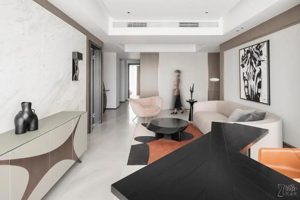设计师围绕“团圆”主题,基调定为现代雅奢。本套作品名为:宸韵,“宸”意指帝王所居,代表尊贵;“韵”乃风度、气质由此得名。平面布局进行重新解构充足,保留了原客厅私人客厅+书房,原餐厅改为主会客厅,原卫生间次卧改为厨房,让该案拥有两个客厅。