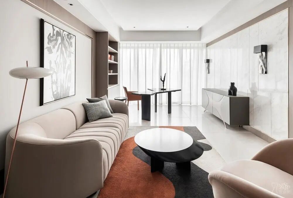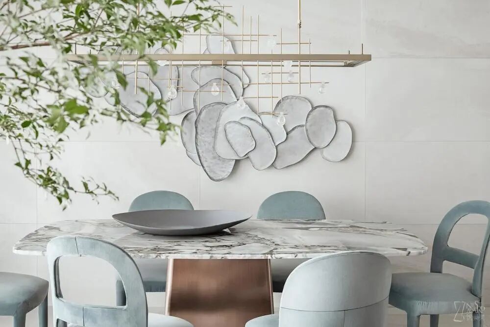 同时在浅色中保留具有轻奢代表性的金属元素和大理石纹理,绒面材质加以点缀。